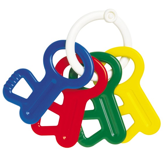 歯固めとラトルの機能両方を持ち合わせています。赤ちゃんの手でもしっかりと握ることができる初めての遊び道具にぴったり。白いリングに赤・青・黄色・緑のカギが付けられています。※白いリングは外せません。