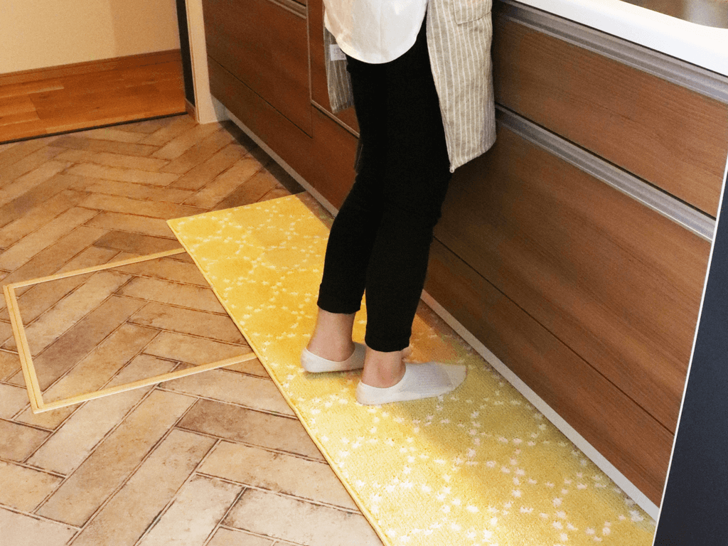 あえて薄く作られたマットは、床にピタッとくっつきフラットになるのでつまづきにくく、キッチンの床ギリギリにある引き出しにも引っかかりにくい仕様です。
