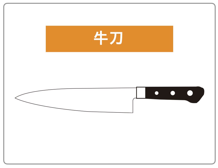 先端が尖った西洋の包丁。肉・魚・野菜・パンに使える。 別名「シェフナイフ」 |