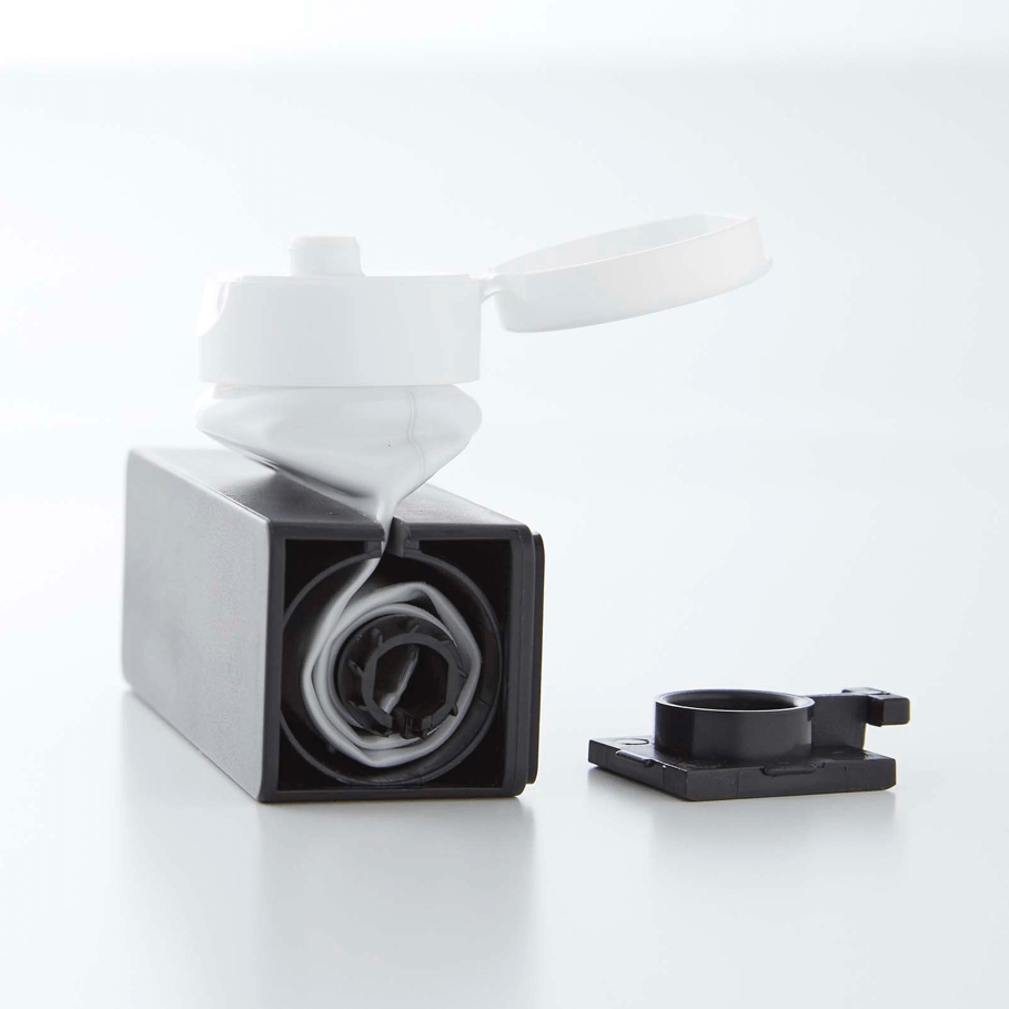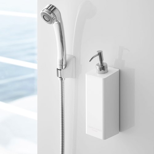 壁面にマグネットで取り付けられるディスペンサーボトル。壁に付けたまま使えます。