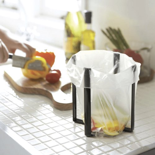 ポリ袋を引っ掛けて使うホルダー。三角コーナー代わりや、ペットボトルを乾かすのにも便利です。