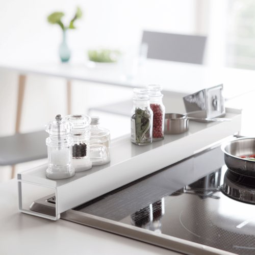 伸縮可能な排気口カバー。棚部分には調味料などを置いてスペースを有効活用できます。