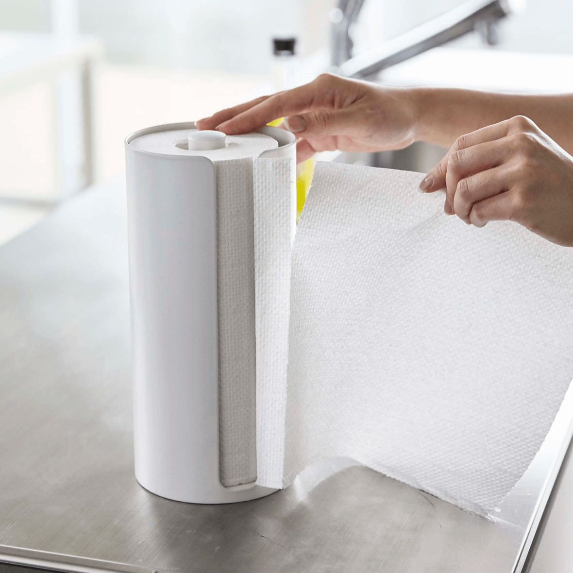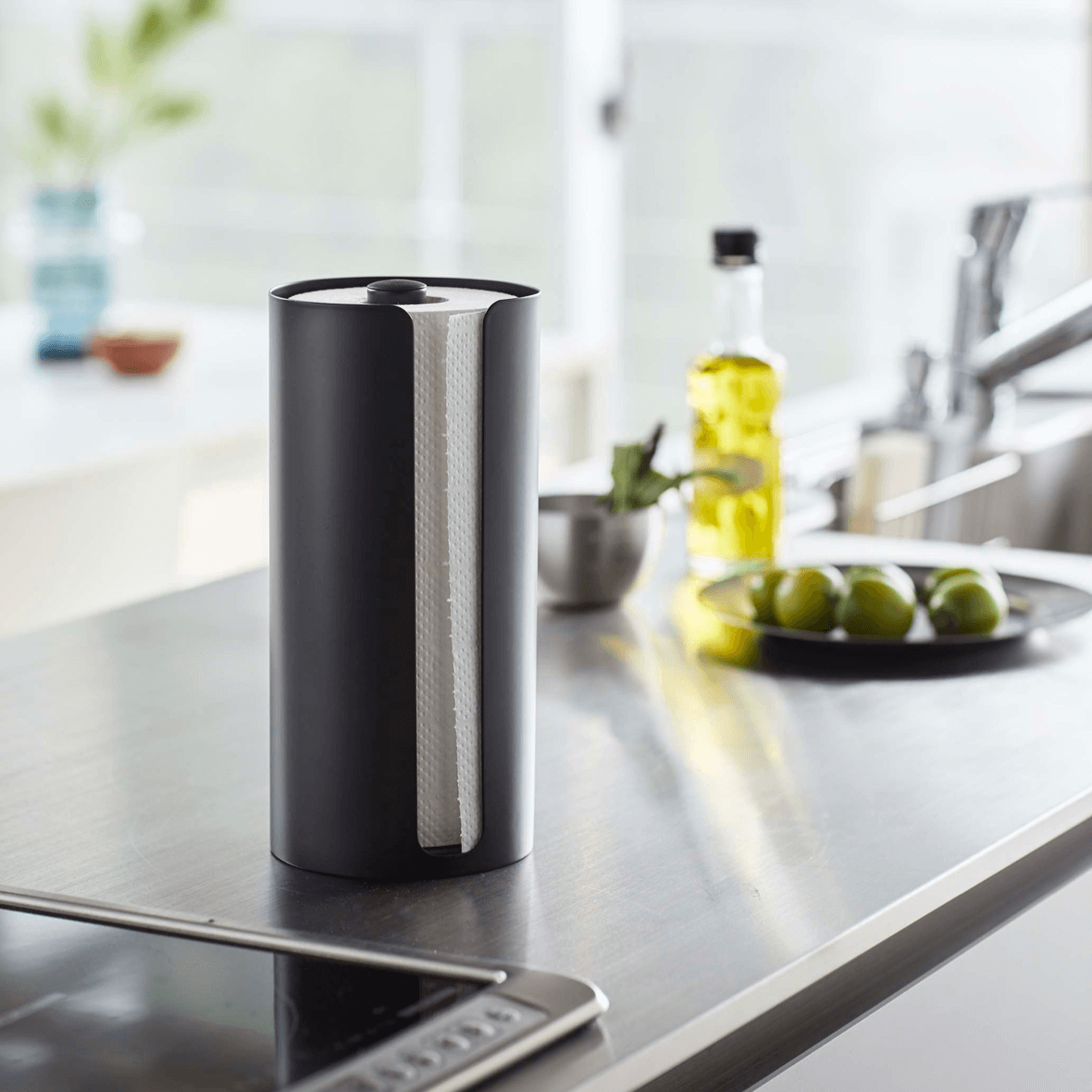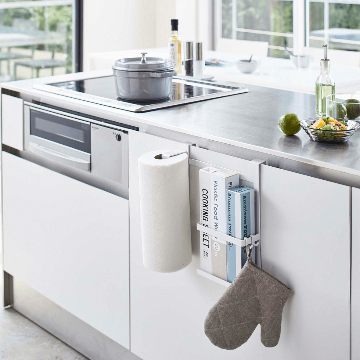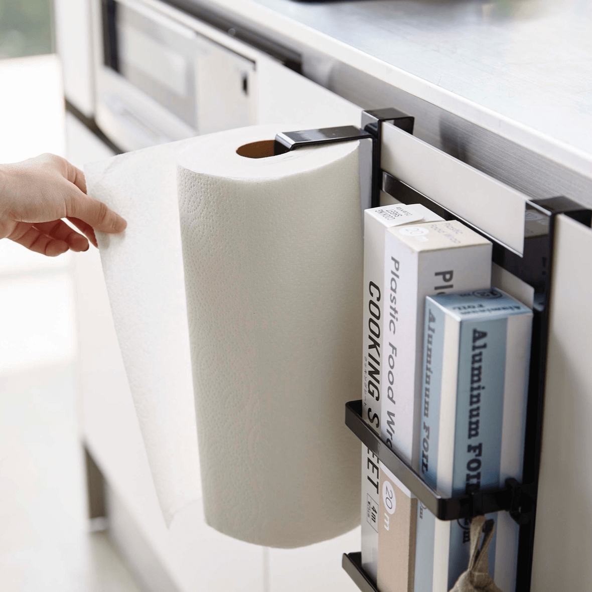キッチンペーパーホルダーとラップホルダーを一緒に!一箇所にまとめることで、キッチンがスッキリと見えます。小物を引っ掛けられるフックも付いています。