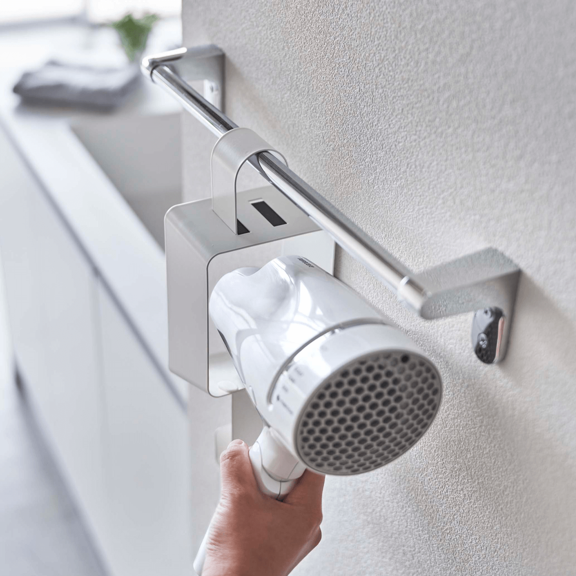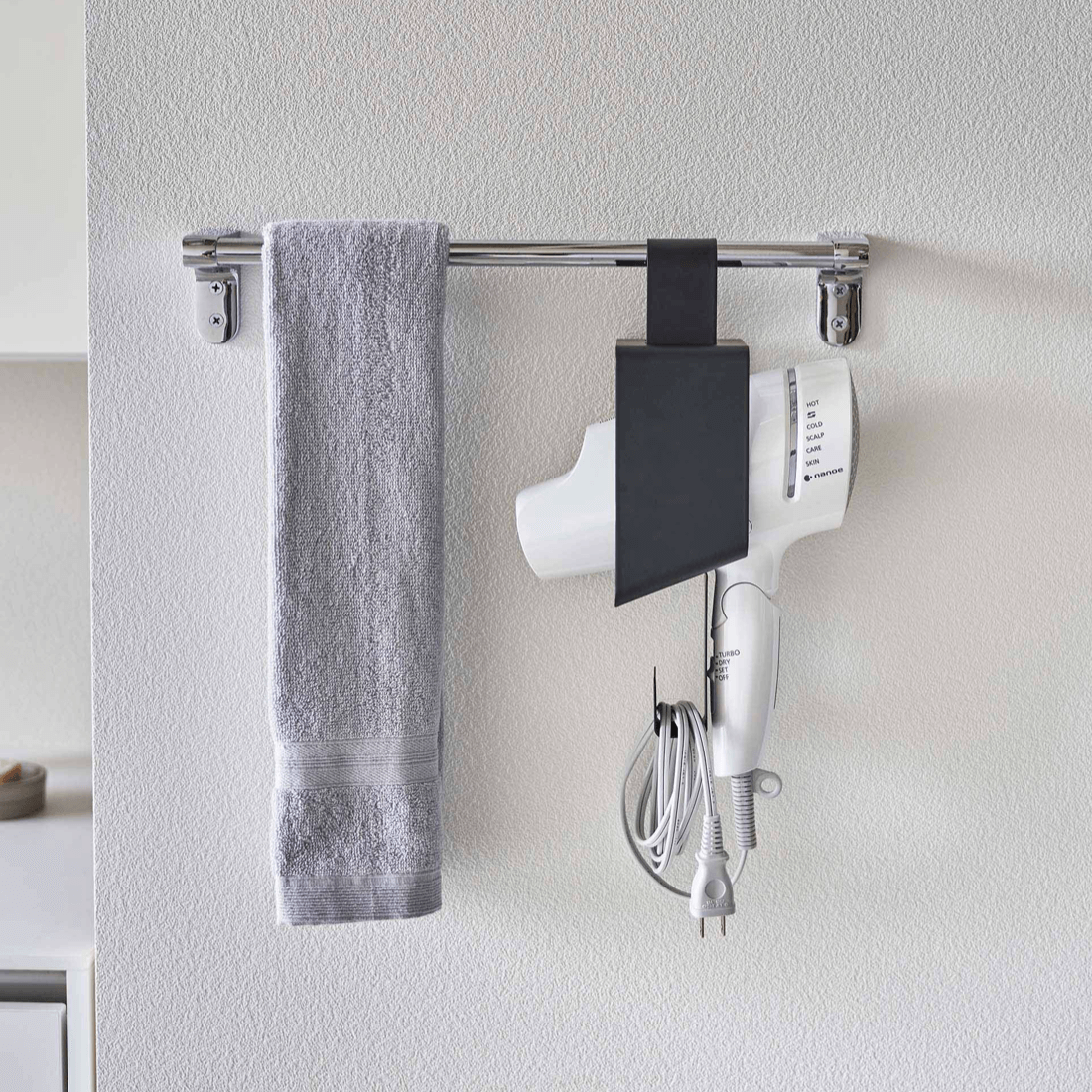 意外と収納場所に困るドライヤー。タオルバーに引っ掛けて使うタイプです。横からスッと取り出せて、コードはフックにまとめてスッキリ。