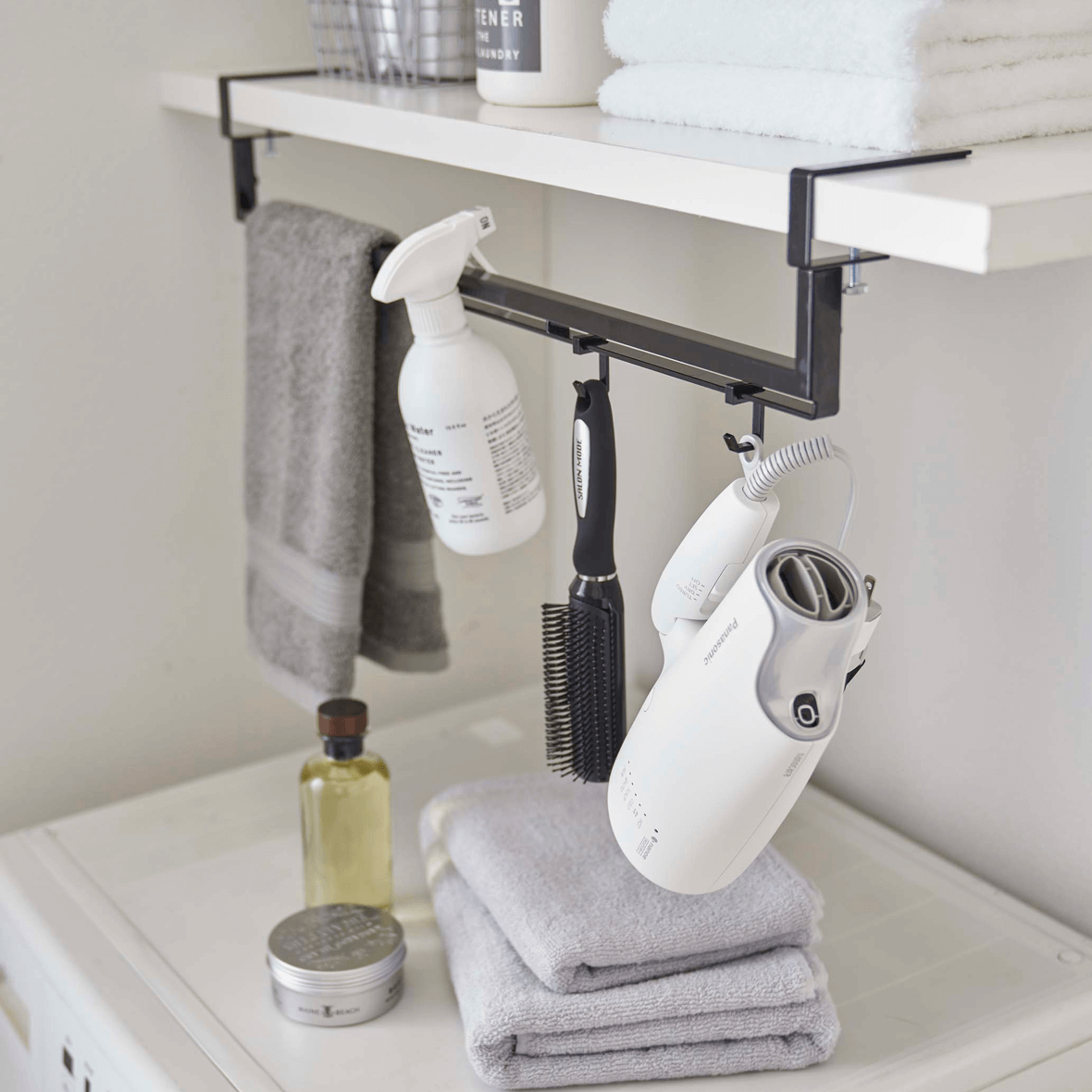 タオル・ブラシ・ドライヤーなど、まとめて収納できるハンガーです。伸縮タイプで、取り付け場所に合わせて横幅を調整できます。