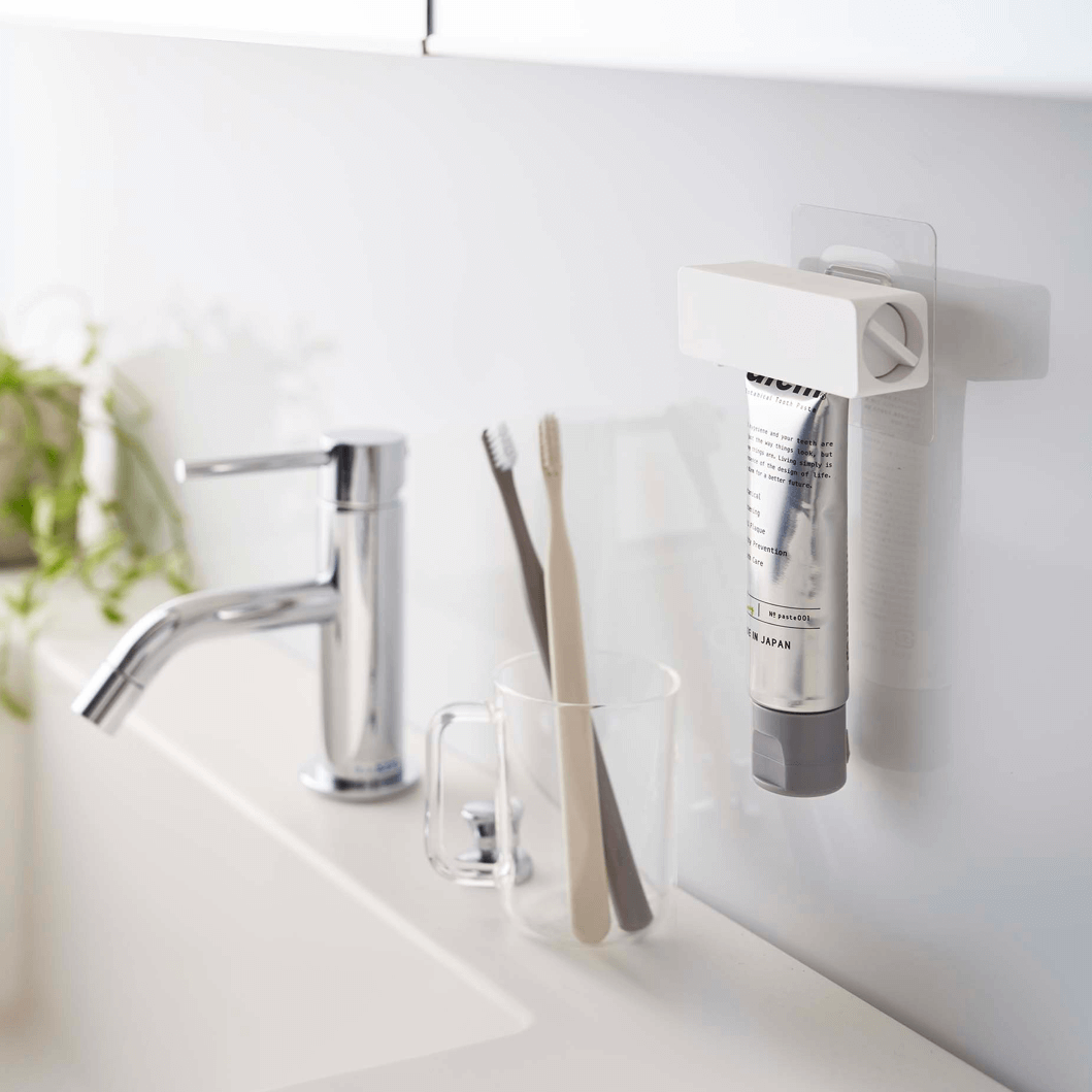 歯磨き粉チューブをフィルムフックで浮かせて収納。使用するときは、ハンドルを回すことで中身をきれいに絞り出せます。