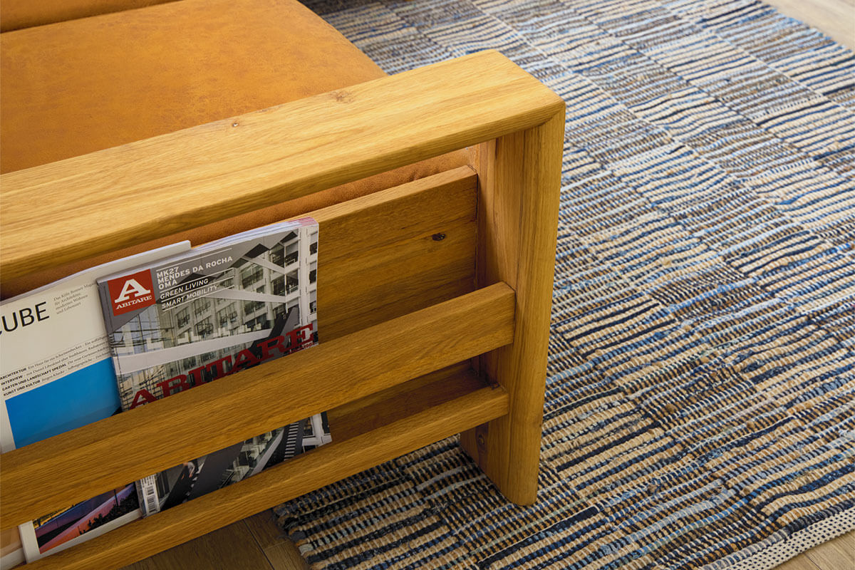 外肘にはマガジンラックが付いているので、タブレットや雑誌を収納でき、インテリアのワンポイントにもなります。