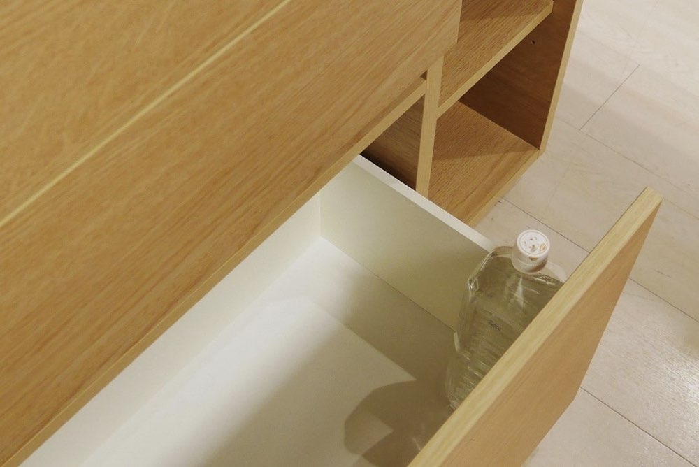 引出し耐荷重は20kg。一番大きな引出しには、2リットルのペットボトルを立てて収納できます。