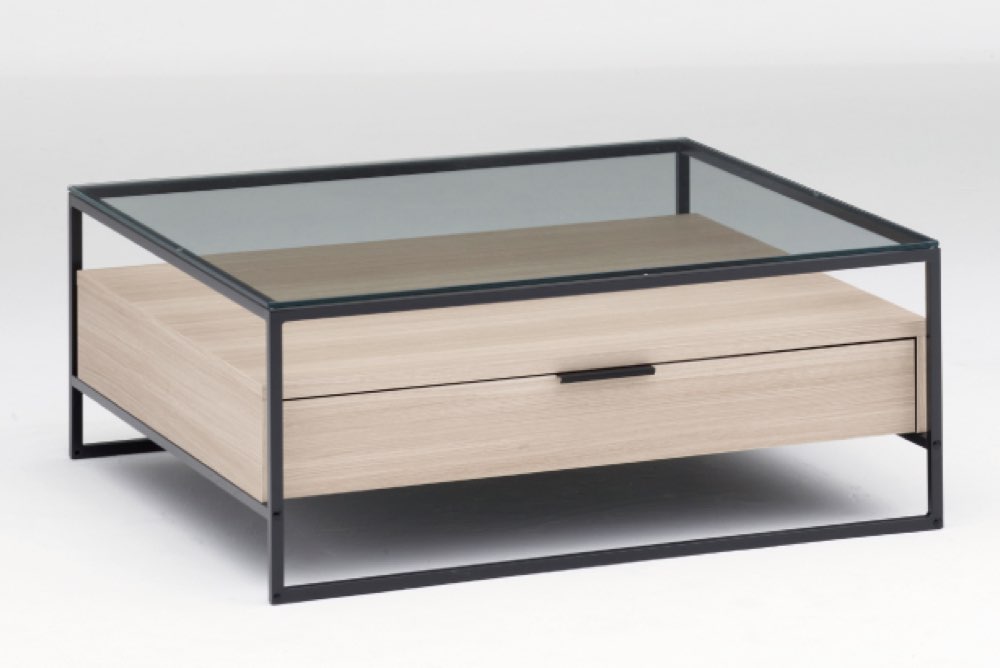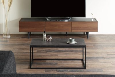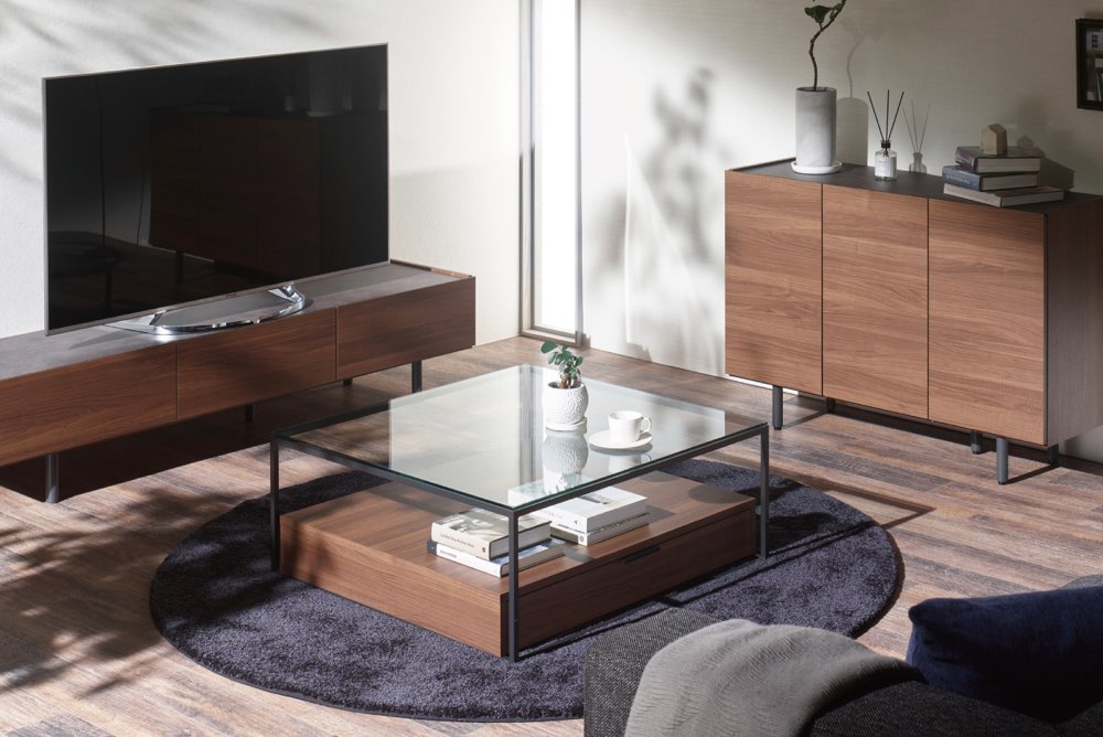 ガラス天板と木製天板を選べるリビングテーブル。直線的で合わせやすいデザインです。