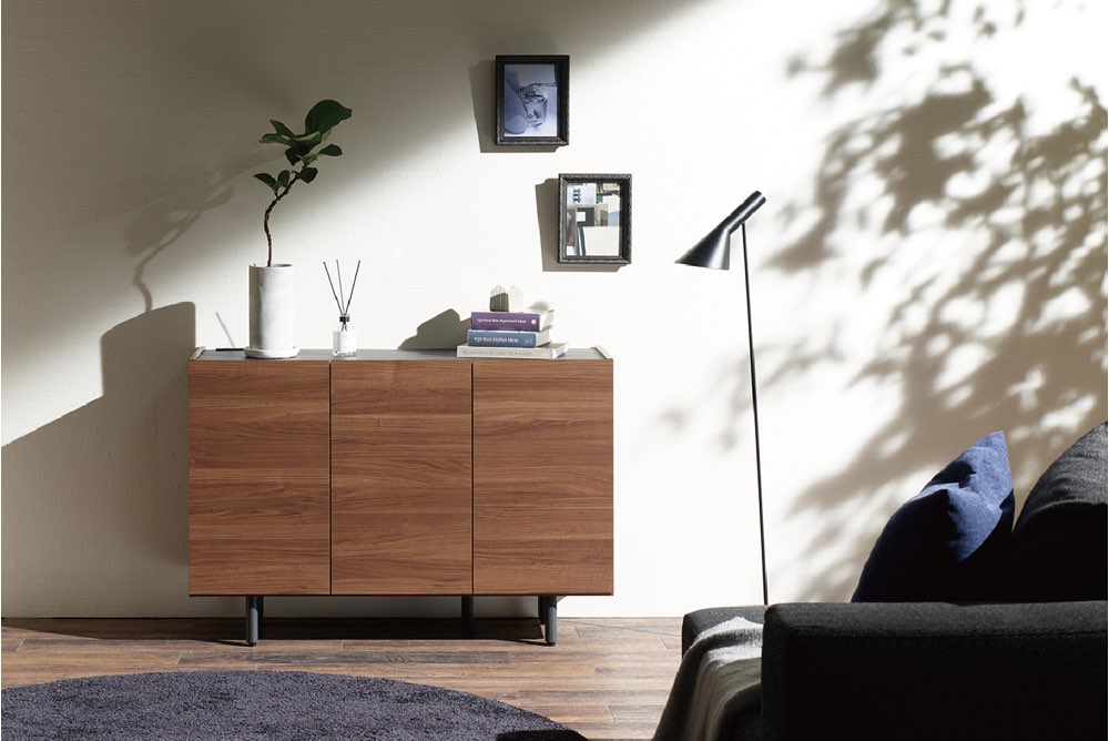 どんなインテリアにも馴染むシンプルなサイドボード。リビングの細々としたものの収納にピッタリ。中が見えないので空間がスッキリとします。