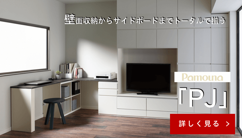 Pamouna(パモウナ)は、愛知県に本社を置く家具メーカーです。食器棚・壁面収納やTVボードなどの収納家具を、開発から製造・出荷まで一貫して行っています。