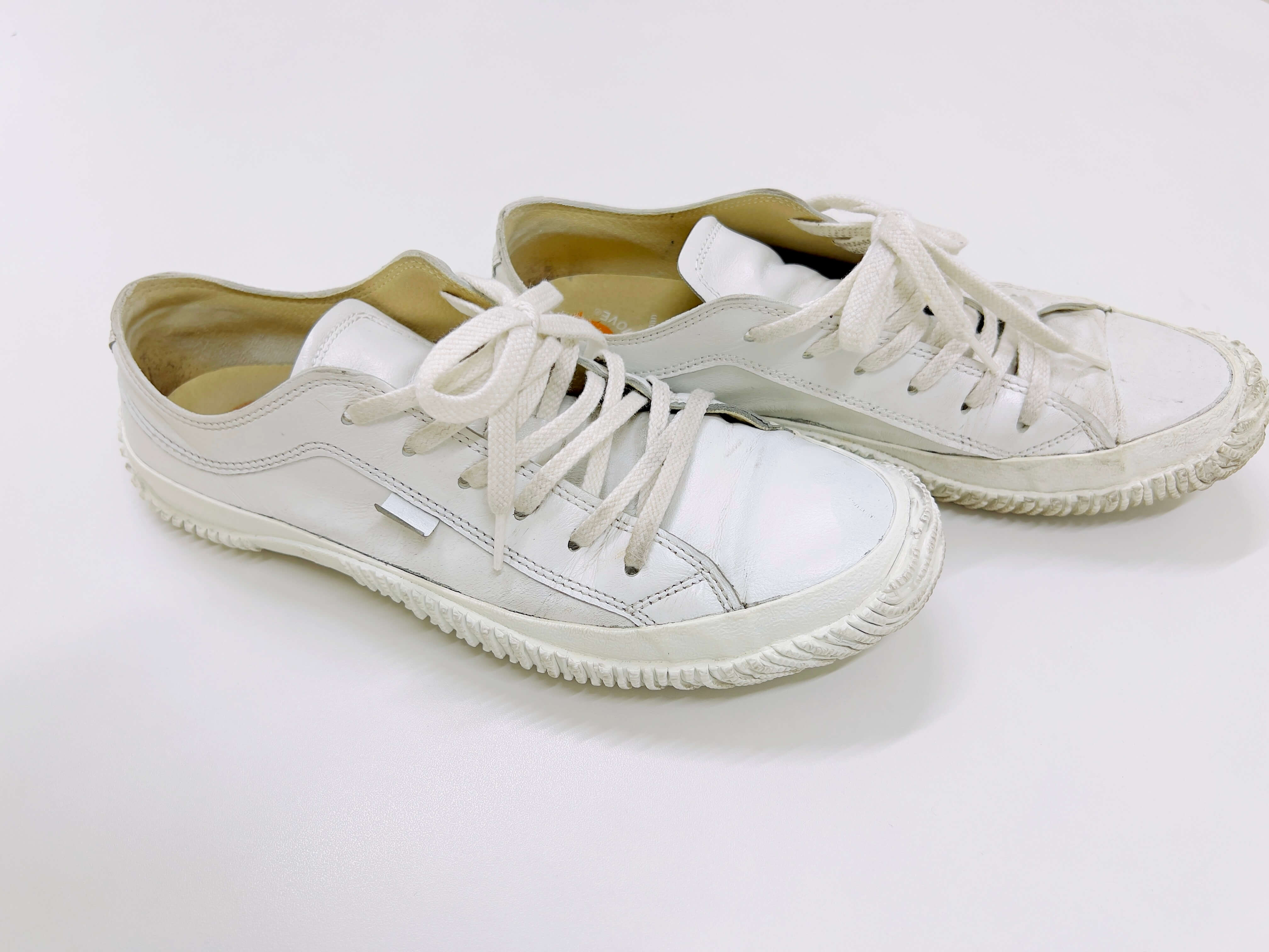 素材は革のスニーカーを洗ってみました。上「洗う前 before」、下が「洗った後 after」です。全体にくすみが取れて、特にソールの部分が綺麗になりスッキリしました。