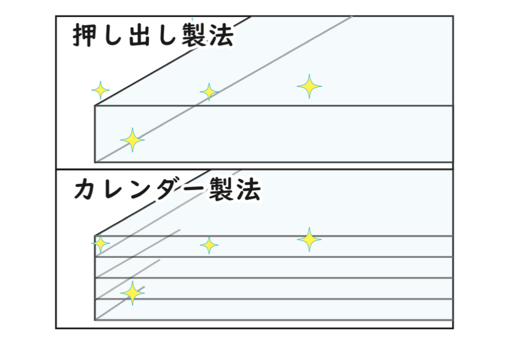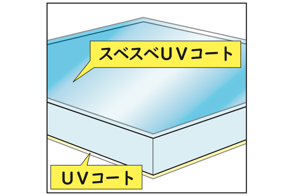 両面のUV硬化コートが軟質塩ビに含まれか可塑剤(カソザイ)の染み出しを完全に防ぎます。また、表面にはすべすべコートを採用し、引っかかりの無い滑らかな肌触りを実現しました。