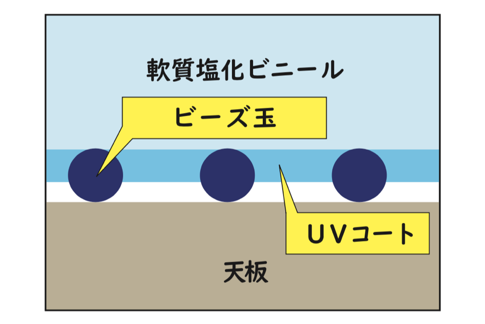 天板設置面にミクロビーズ玉を散りばめコーティングすることで、天板とマットの間に隙間を作ります。この加工により過度な張り付きを防止し、天板塗装を傷める心配もありません。