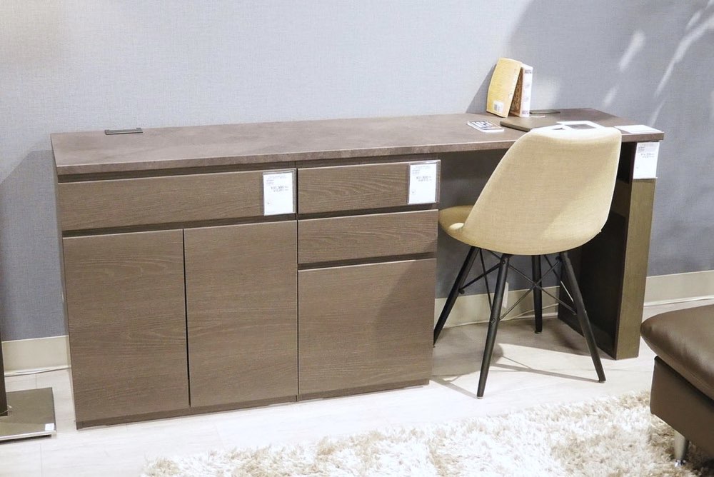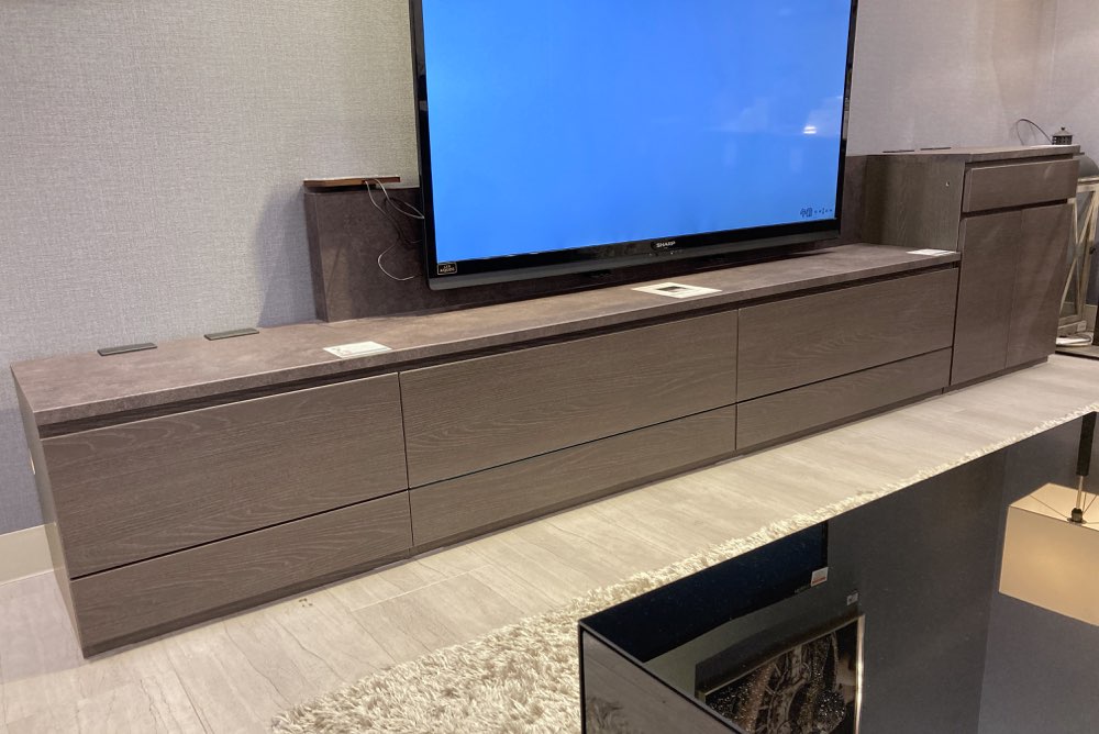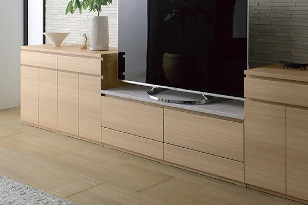 本体4色、天板6色から組み合わせを選ぶローボード。横幅240㎝まで対応で、大型TVも置くことができます。