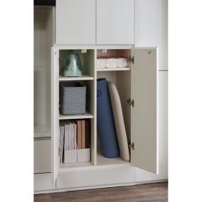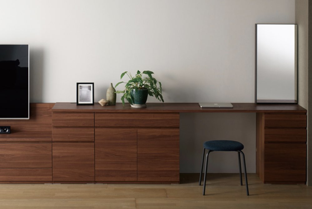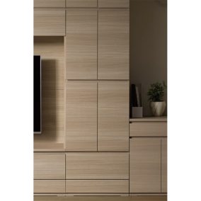 キャビネットを組み合わせてつくる壁面収納。直線的でフラットな美しいデザインです。幅オーダーアイテムもあるので、お部屋にピッタリのサイズで設置できます。