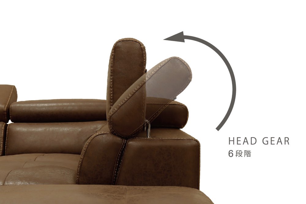 ゆとりあるサイズ感で、全体にバランスよくデザインステッチを施した、こだわりの逸品です。ヘッドレストは手動でそれぞれお好きな角度に調節可能です。
