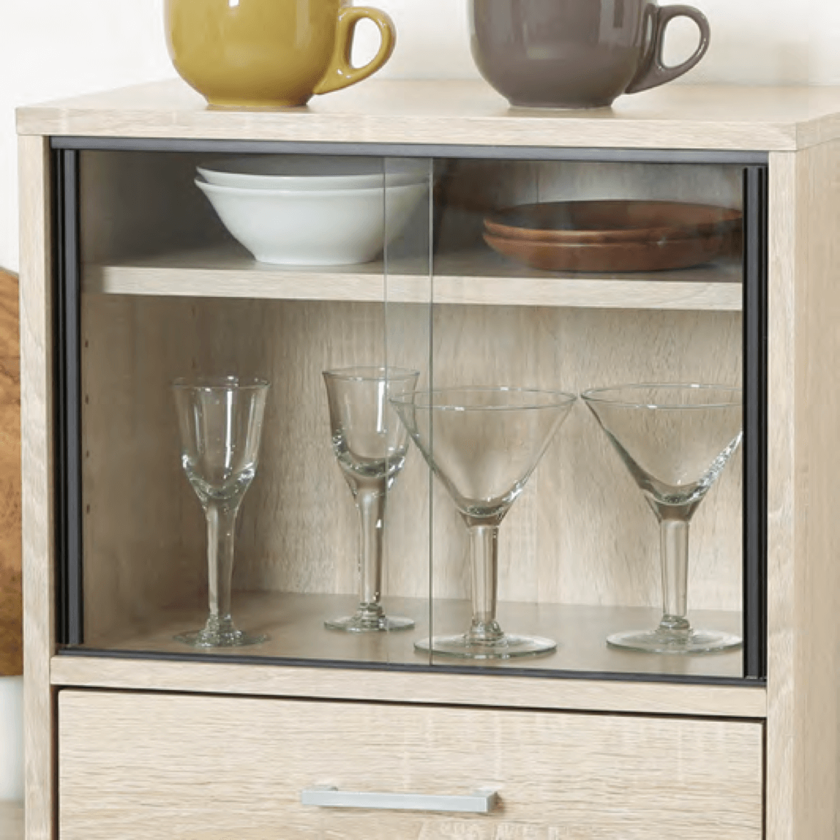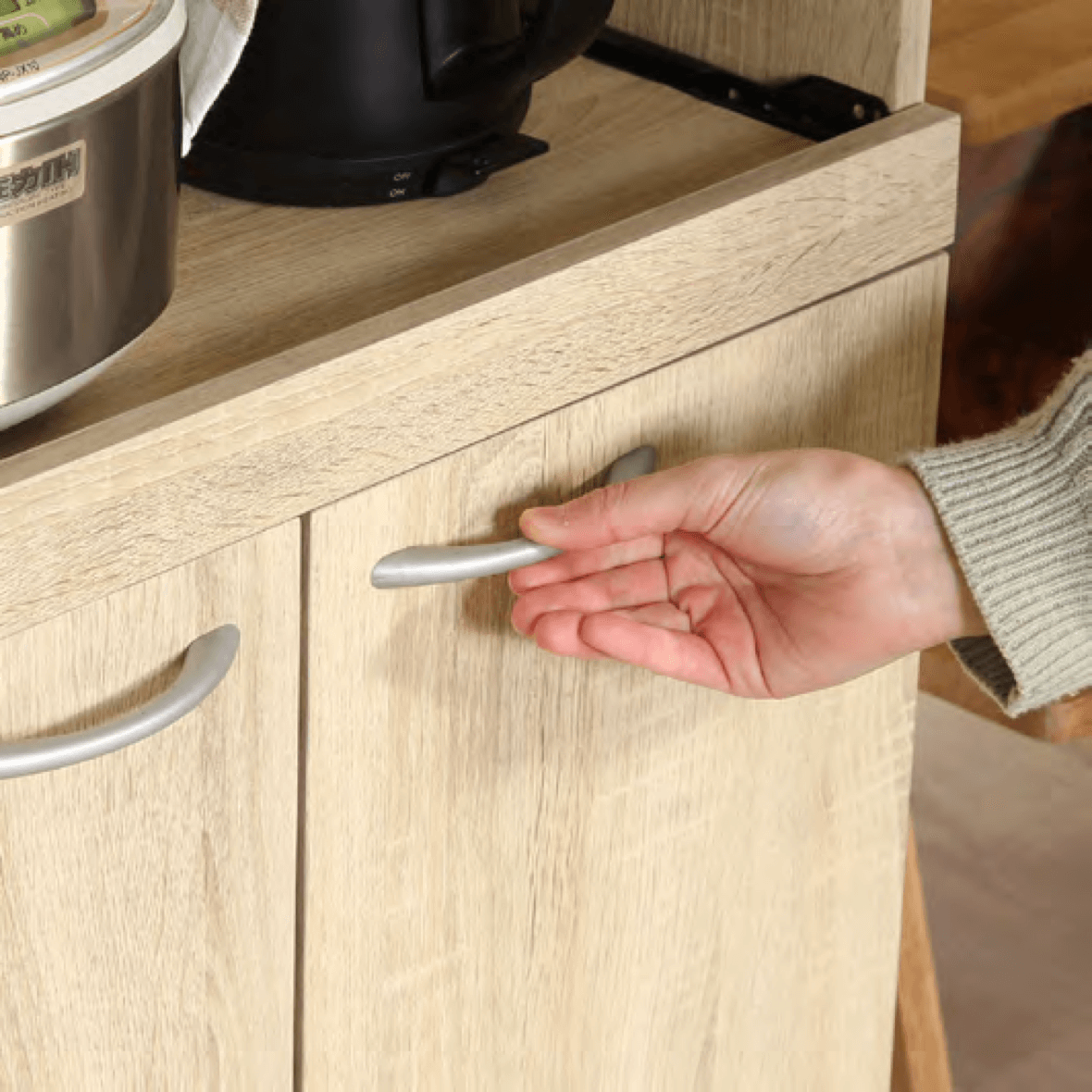 扉はスライド式なので、狭いスペースにも置きやすく便利です。奥行が少ないス ペースでも扉の場所をとらず、食器を出 し入れすることができます。