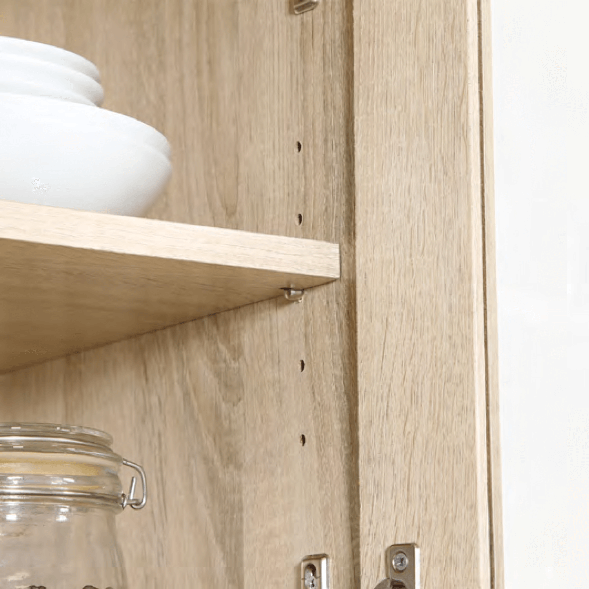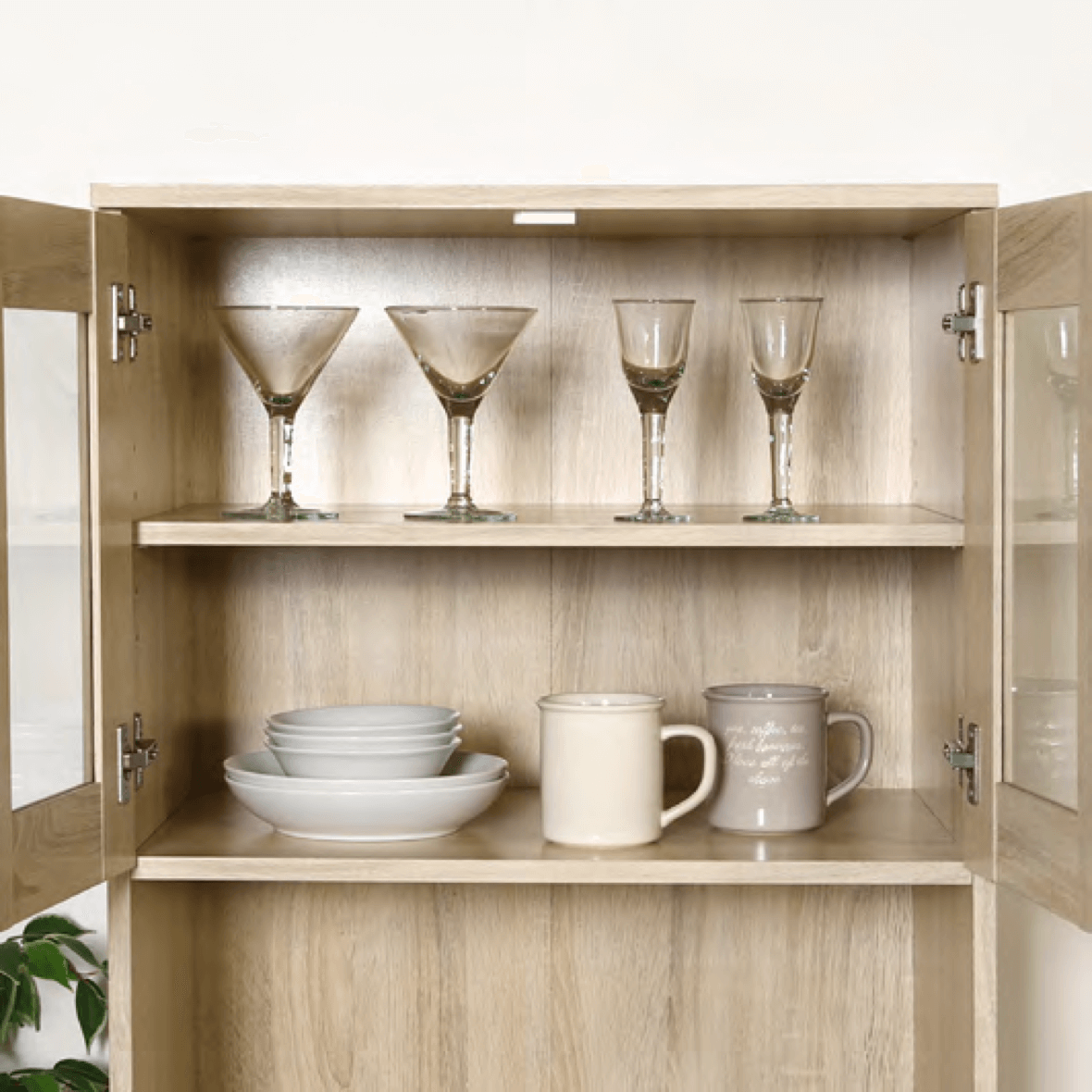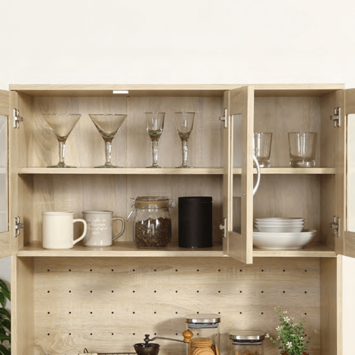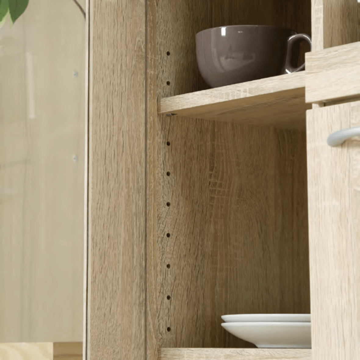 棚板は高さを調節できる可動棚で、平た いお皿から背の高いコップまで無駄なく 収納できます。