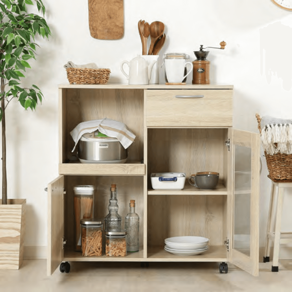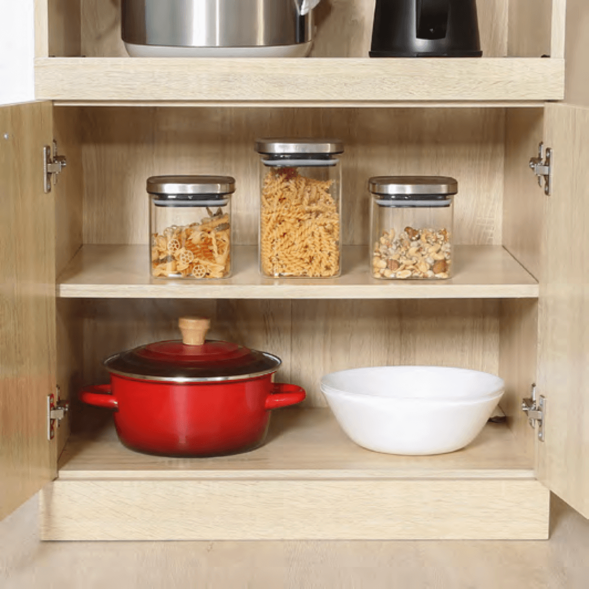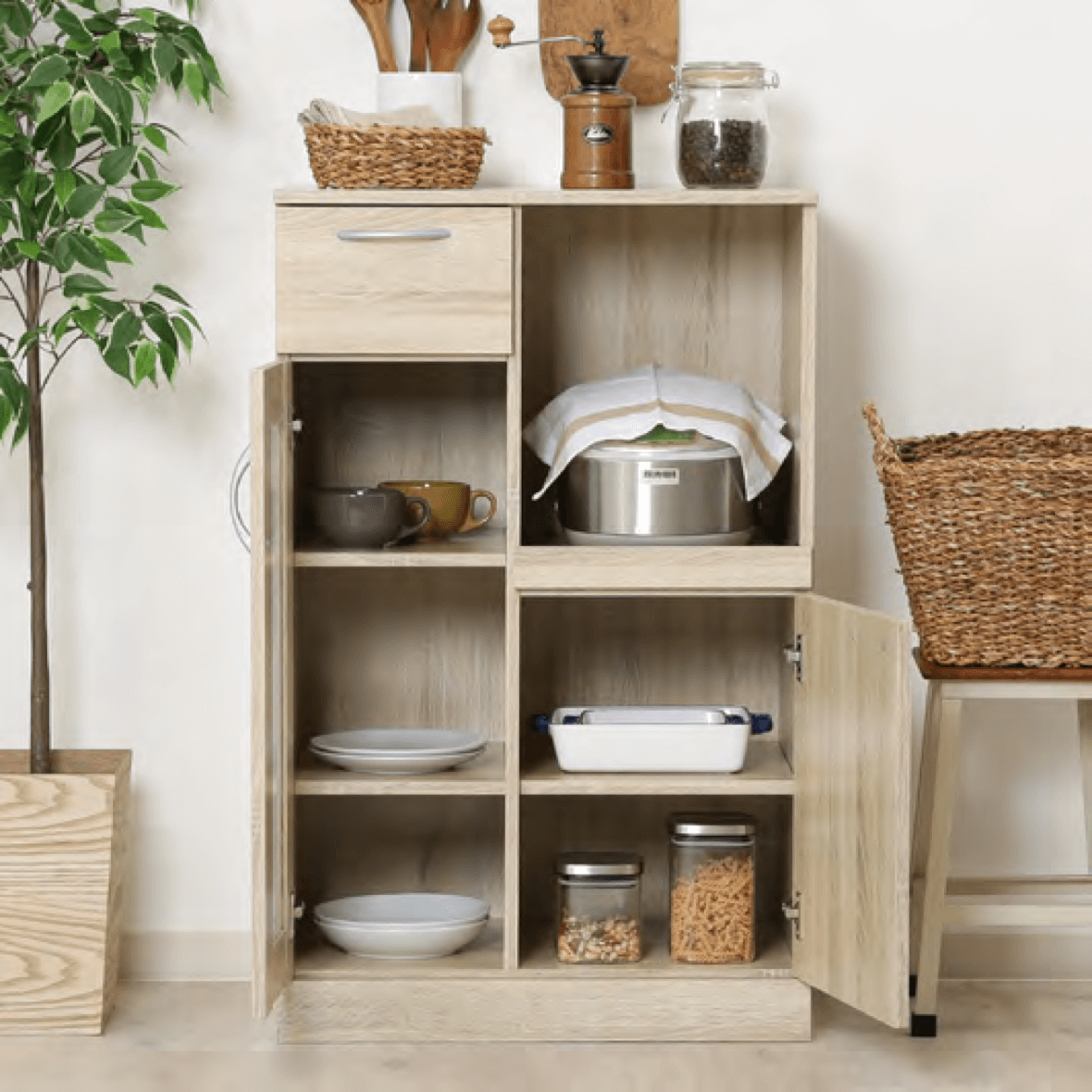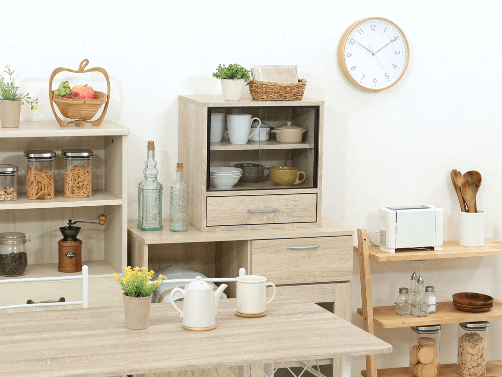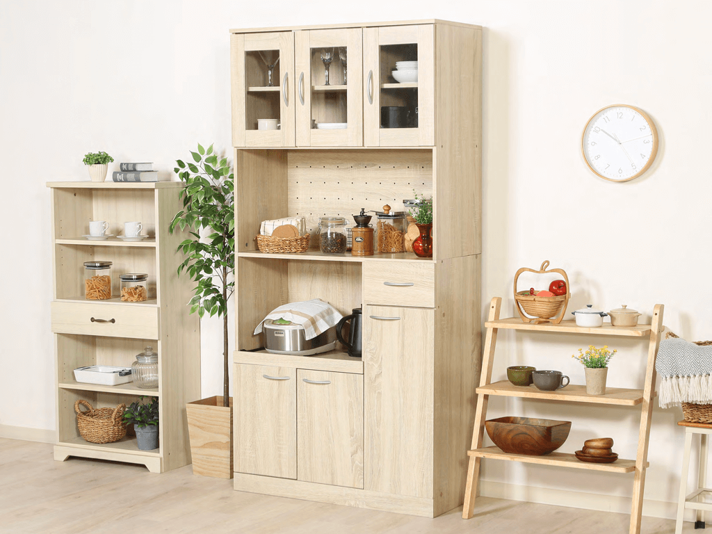 2 つの戸棚に分かれていて、細やかな収納が可能。食器や缶詰、お菓子などスッキリ 収納できます。
