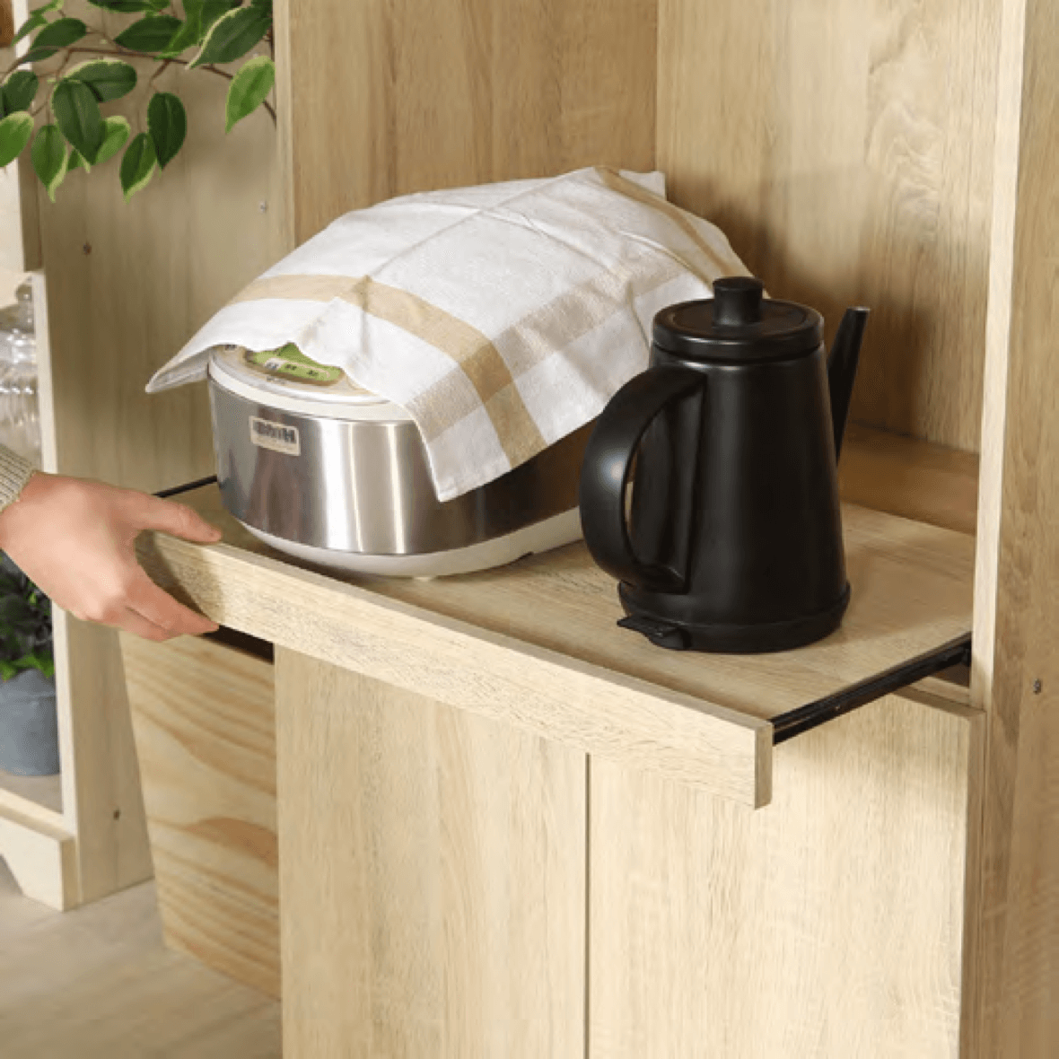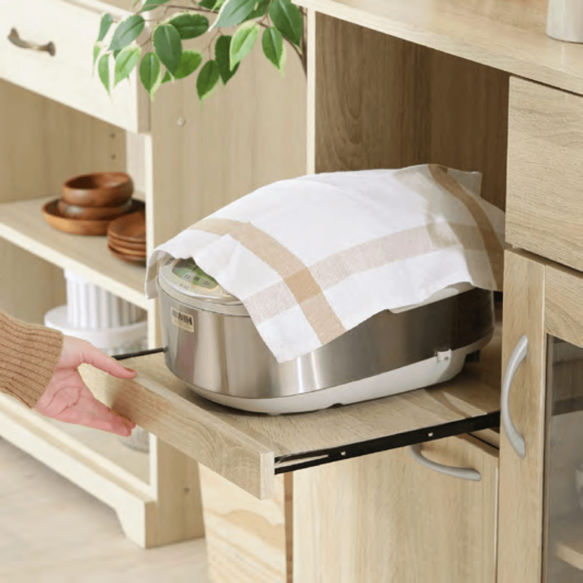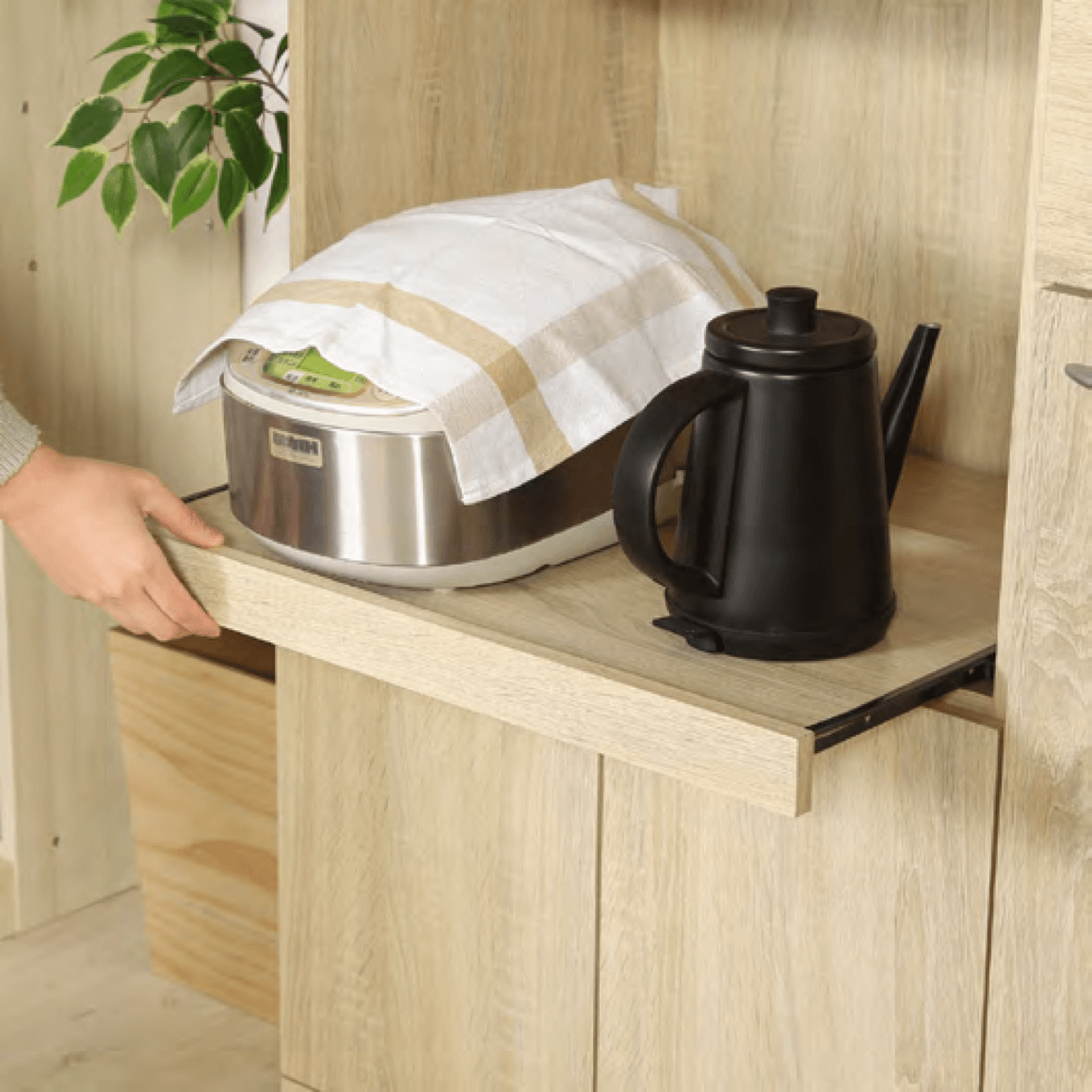 引き出して使えるスライド棚です。炊飯時やお湯を沸かす際に出して使うこと で、蒸気による棚の劣化を防ぐことがで きます。