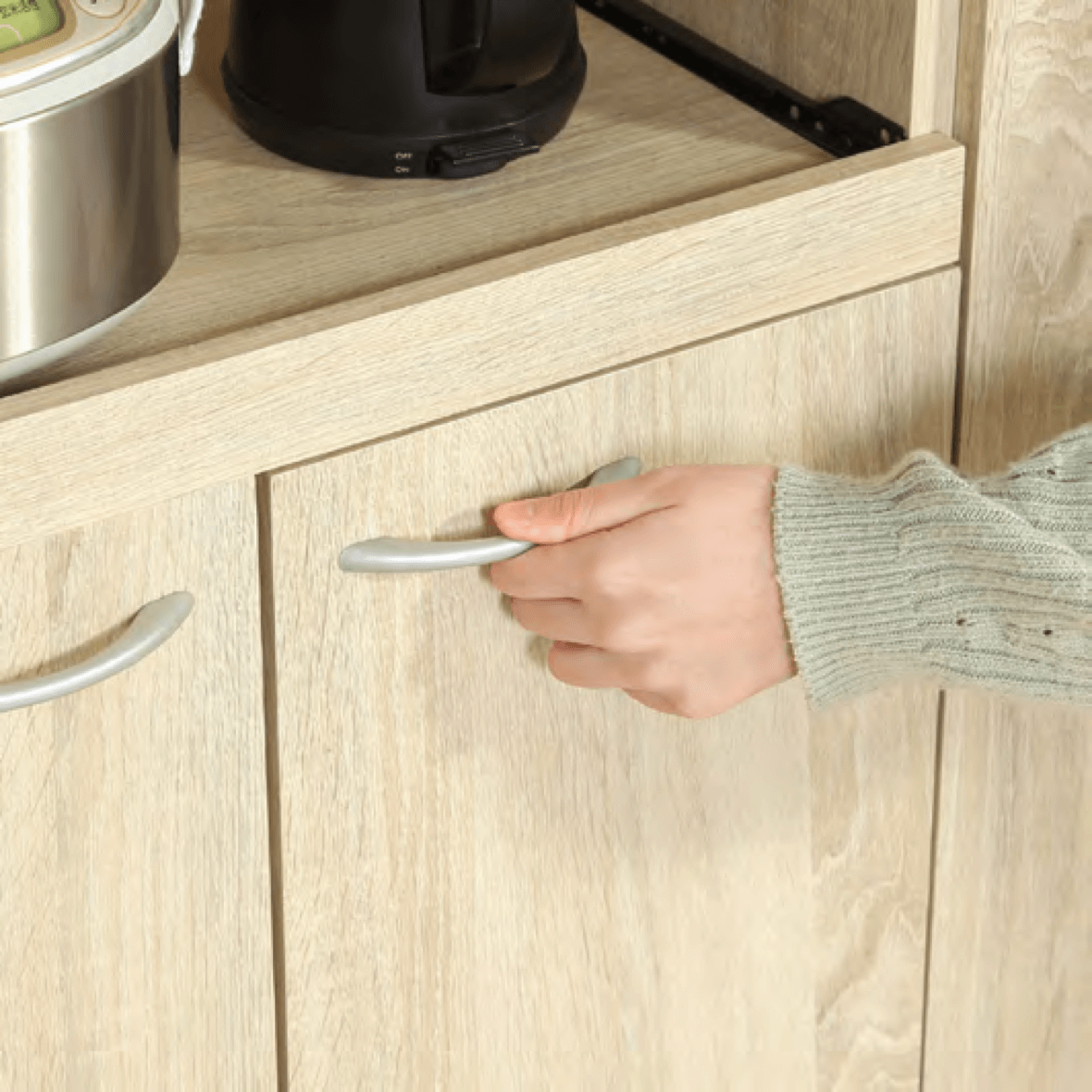 すべての棚や引き出しには掴みやすいハンドル式の取っ手がついています。