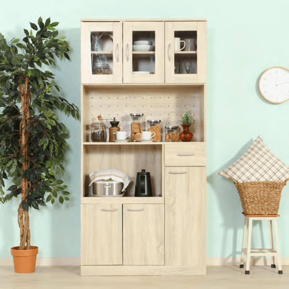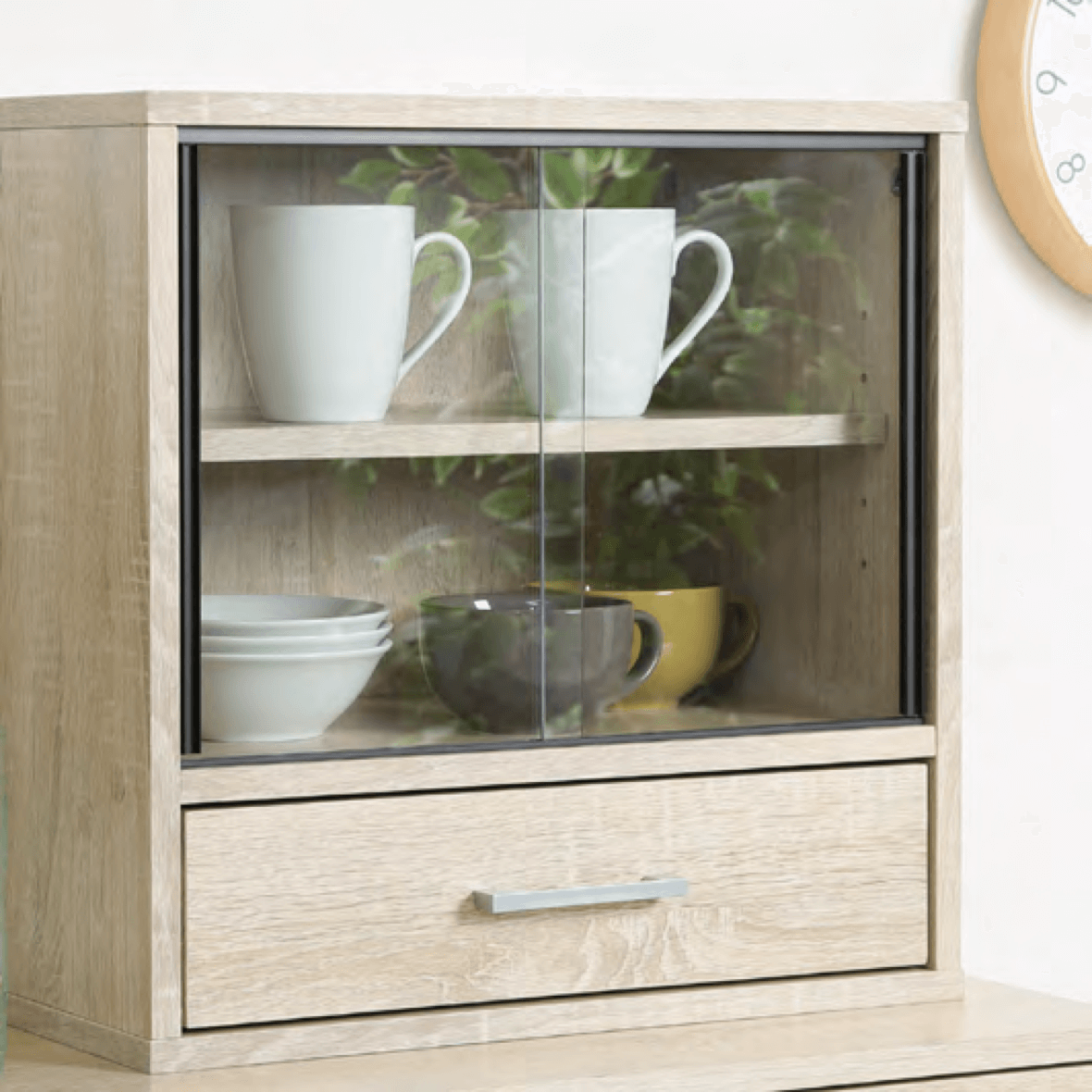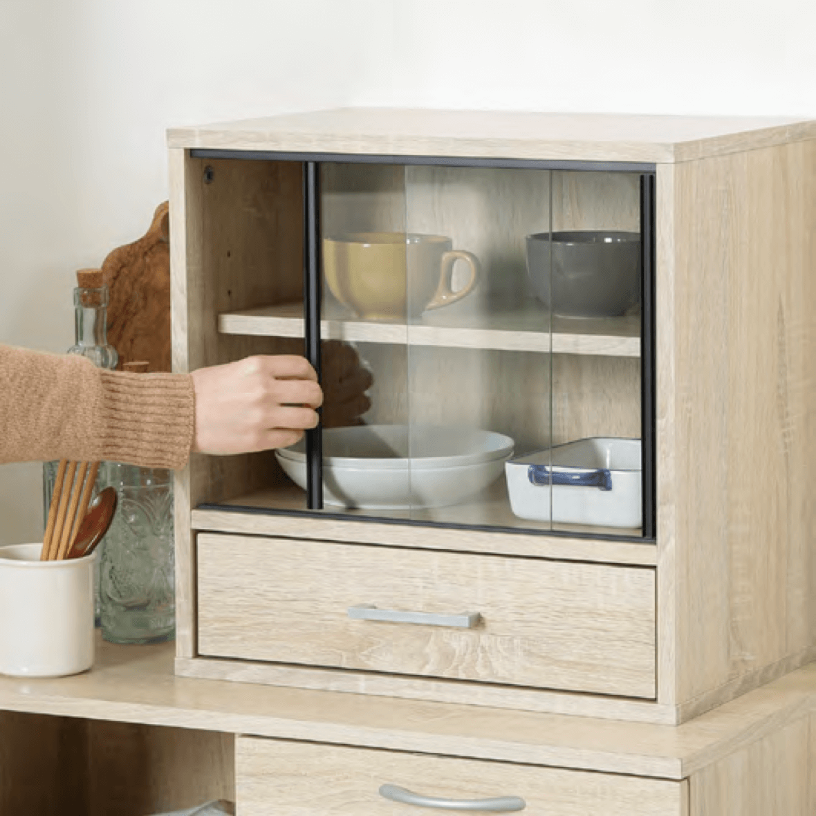 場所を取らずに設置できる、幅45cm のコ ンパクトな食器棚。キャビネットや卓上 に設置できます。