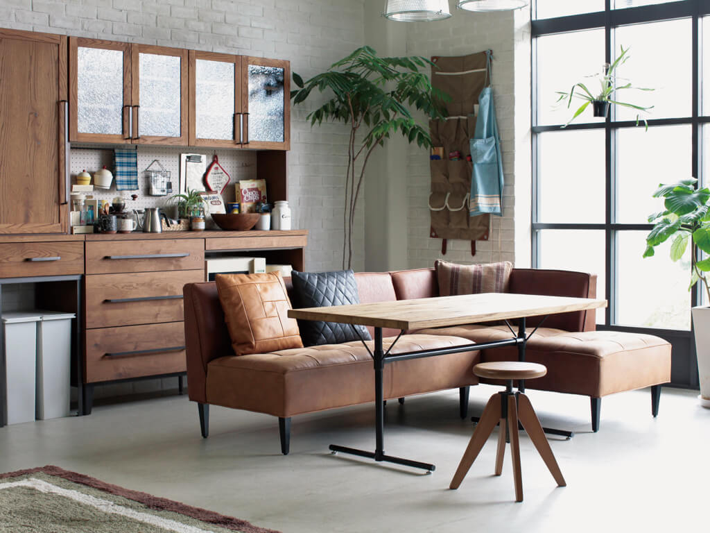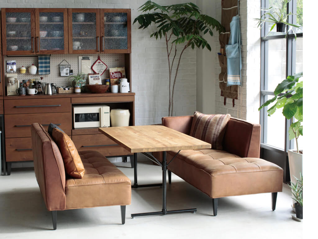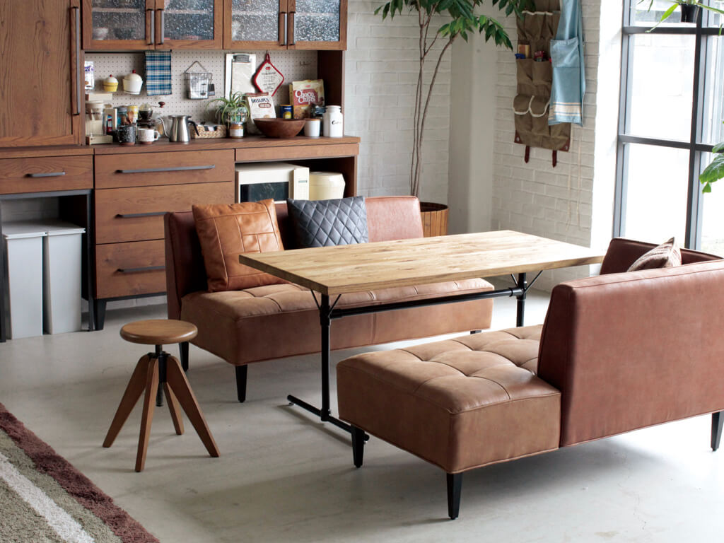 革の風合いを表現しつつ、摩擦や汚れなどにも強い高機能素材のため、ダイニングシーンでの使用にピッタリです。