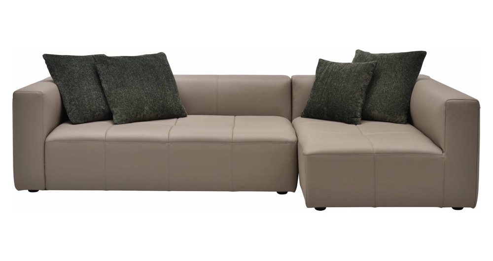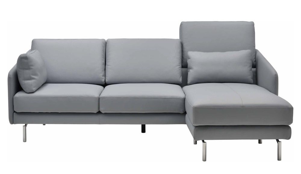 座面や背のフォルムが印象的なレザーソファ。自由な姿勢でくつろげる変形カウチソファです。