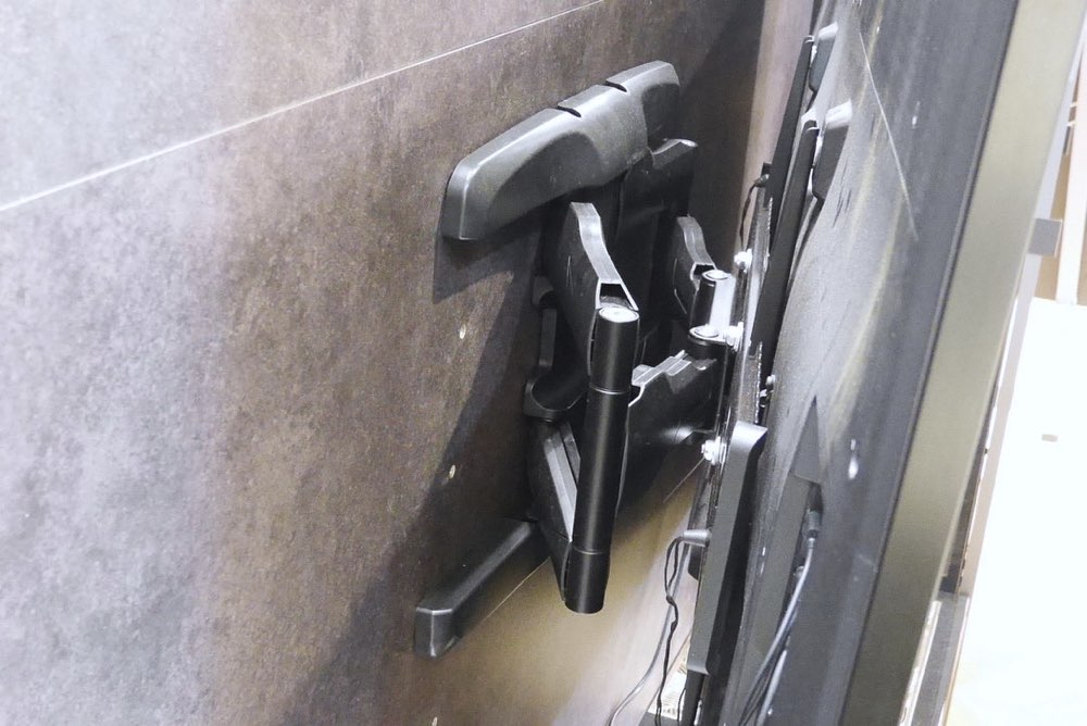 ボードの背面に壁掛け金具を取り付けるだけで、施工することなく壁掛けスタイルにできます。TVを浮かせることで、見た目が美しく洗練された印象になります。