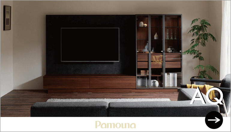 オープン棚やサイドのキュリオケース(ガラス扉のキャビネット)に、お気に入りの小物を飾ってインテリアを楽しめます。