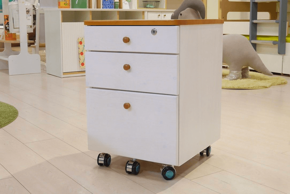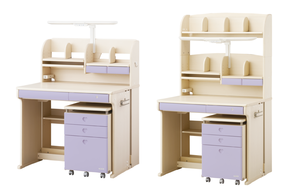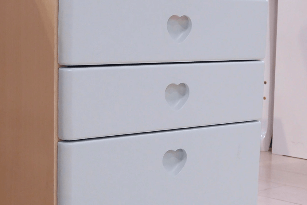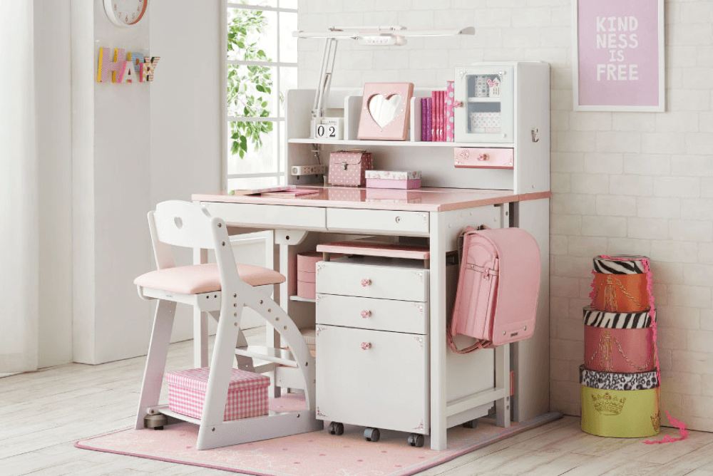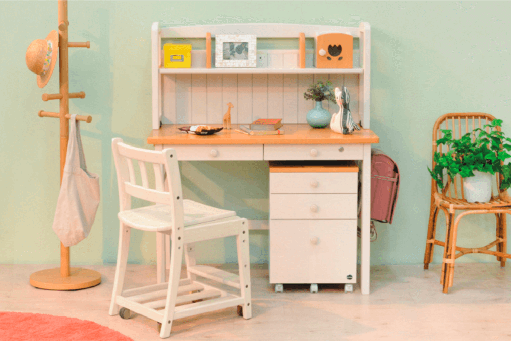 ホワイトウォッシュ色の本体に、前板のカラーが選べるカラーデスク。パステルカラーとハートのくり抜きが可愛らしいデザインです。