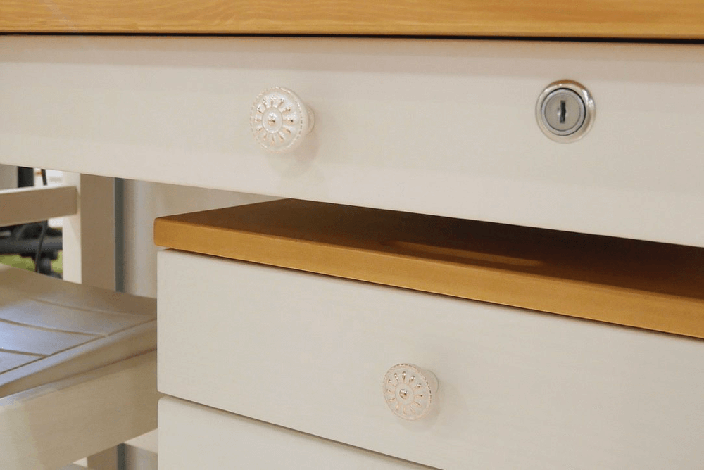 スッキリとしたデザインのカントリーデスク。陶器の取っ手やミニドレッサーが心をくすぐります。