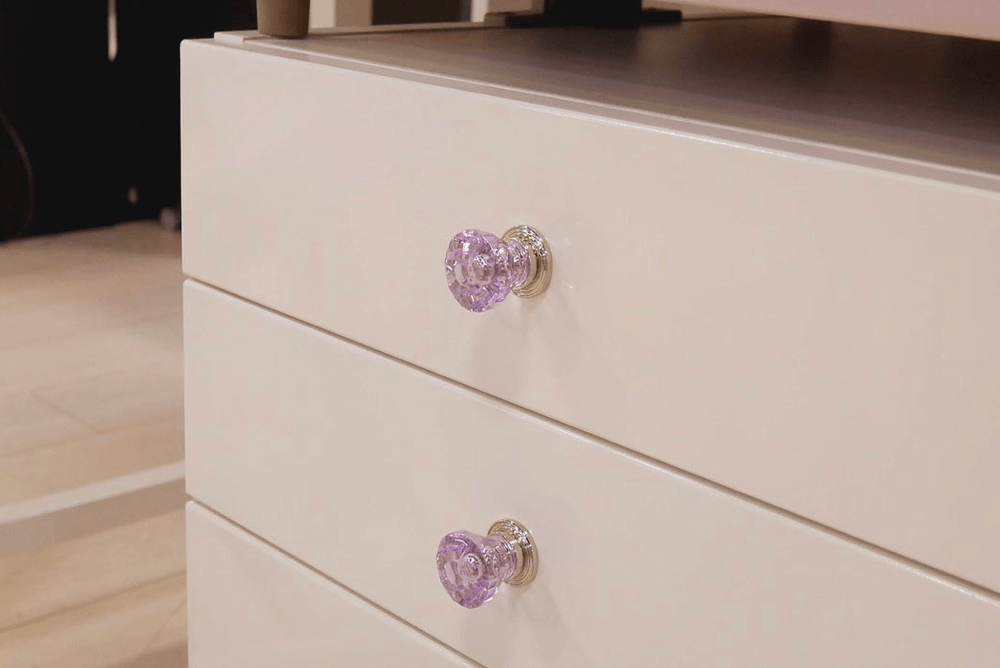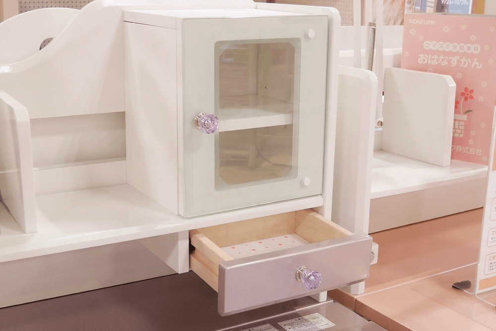 ツヤっとした鏡面仕上げのプリンセスデスク。クリスタルの取っ手が可愛く、好きな場所に貼れるデコレーションシールも付いています。