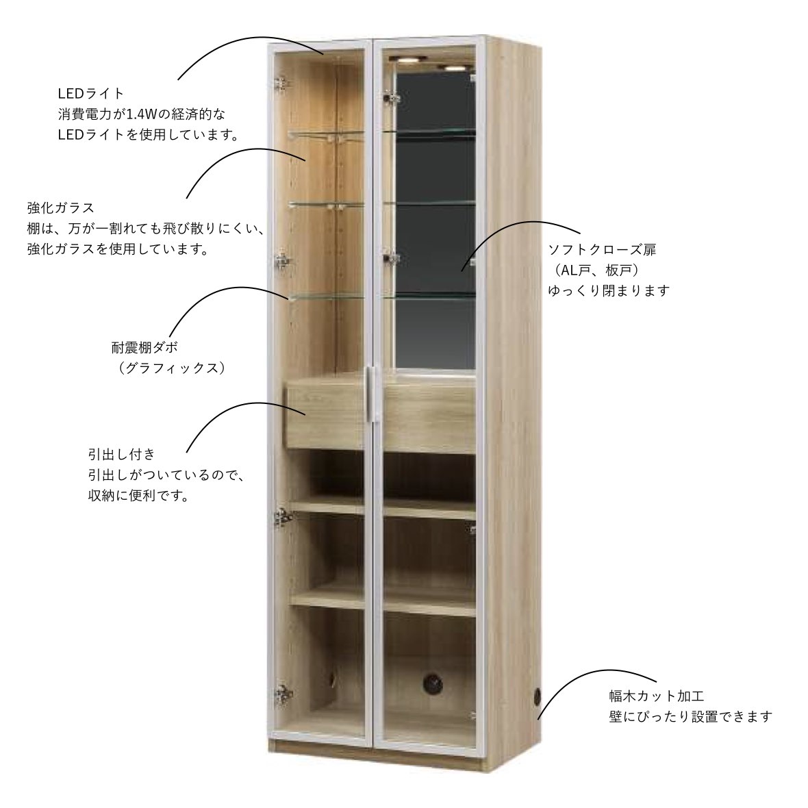 リビングルームや書斎に置きたい、「コレクションボード」兼「書棚」タイプのフレイアです。本体プラス上置きを設置すれば、造り付け工事不要の「壁面ディスプレイ収納」になります。本体上半分は、ガラス棚でLEDライトがあるので、ライトアップされて、ディスプレイを美しく見せることができます。