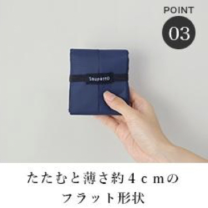 両端を引っ張るだけで一気にたためる革新的なコンパクトエコバッグです。その使い勝手の良さから人気を博しています。シュパットは、そのユニークなプリーツ構造により、使用後は瞬時に帯状にたためる点が最大の特徴です。