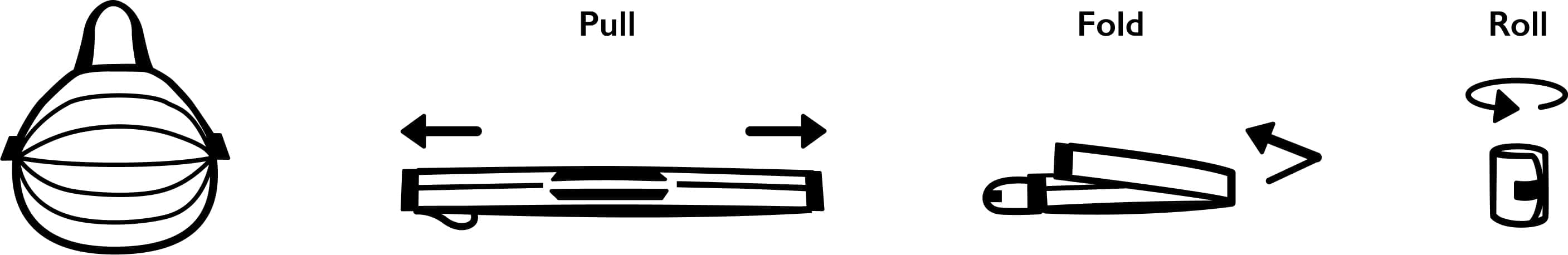 - 簡単な折りたたみ: バッグの両端を持って引っ張ると、プリーツに沿って一気に平らな形状になります。あとは2回半分に折り、丸めるだけでコンパクトに収納できます。