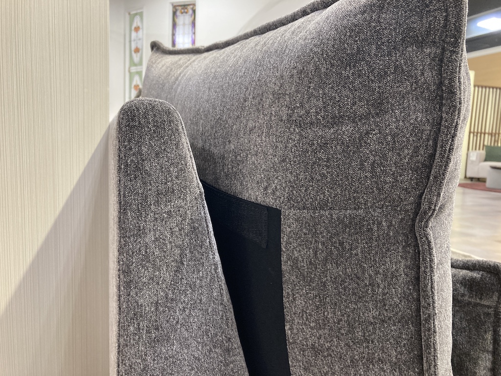 ソファの下はお掃除ロボット通れます(厚みあるラグ、高さのあるお掃除ロボットの場合は注意)。大きい背もたれクッションにはたっぷりシリコンファイバーが入っておりふんわりと柔らかく、包み込まれるような掛け心地。背クッション(右)はマジックテープで固定もできます。