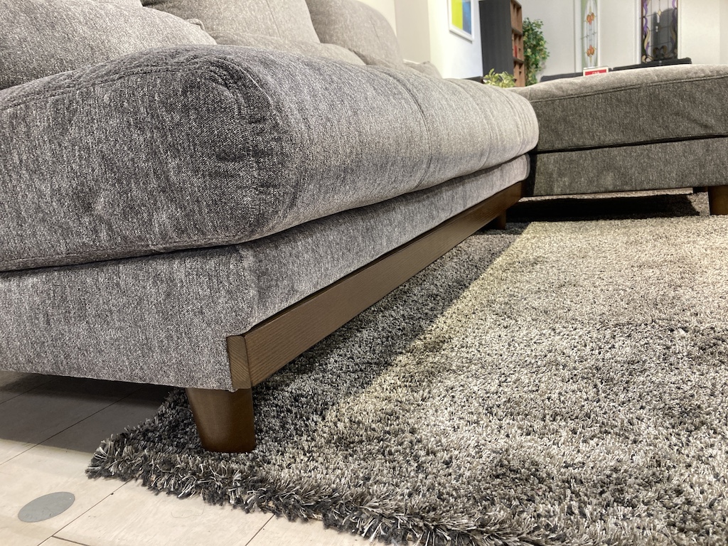 | ソファ下部はブラウン木部ベースが良いアクセントになっています。脚高さは約10.5cmあります。 | 座面と腰クッションにふんわりフェザー入り。ダウンジャケットと同様若干の飛び出しあります。 | |
