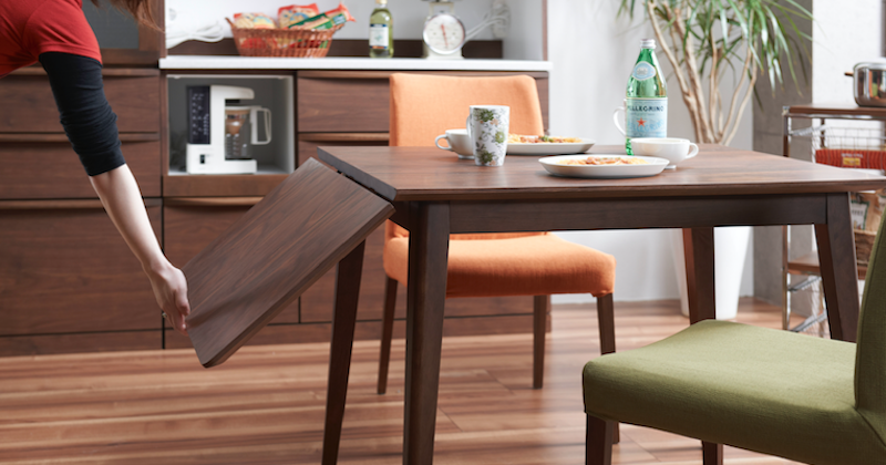 来客時には大きなテーブルが欲しいけれど、普段は限られたスペースを広く使いたいという場合には必要な時だけテーブルを大きくできる伸長式テーブルがオススメです。