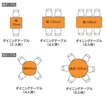 一人分のスペースを基本に、人数によって必要となってくるテーブルのサイズを考えると以下の通りになります。