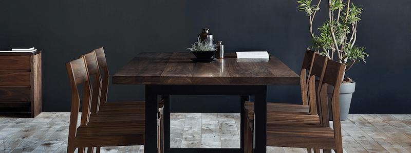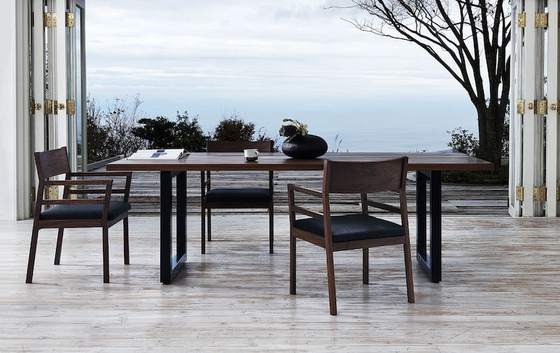 無垢材のウォールナットと、丈夫なアイアンフレームの組み合わせ。異素材の絶妙なバランスが、ダイニングに安定感を与えてくれます。その直線的ですっきりとしたフォルムは、”primitive modern(プリミティブ・モダン)”と呼ぶにふさわしい佇まいです。