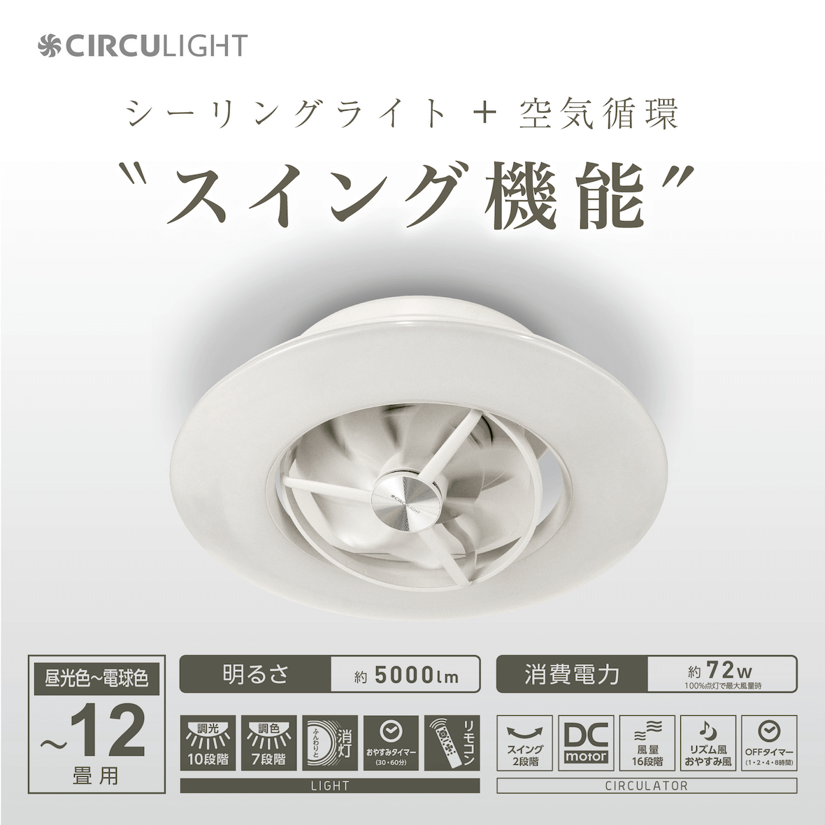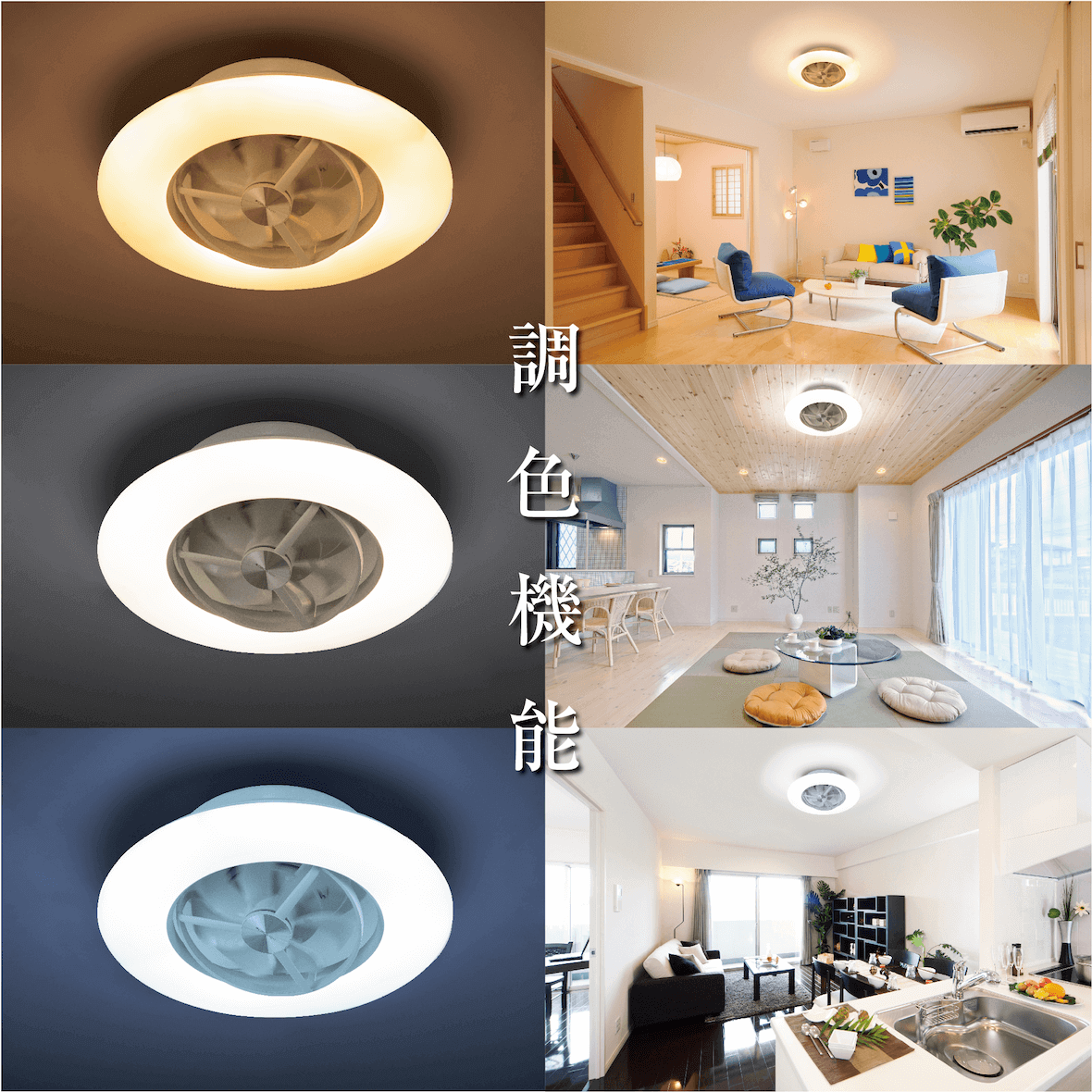 ウォークインクローゼット、トイレ、洗面室、内玄関など床にサーキュレーターを置くには狭い場所でも天井に取り付ければ場所も取らずに室内空気を循環します。昼光色タイプと電球色タイプが選べます。