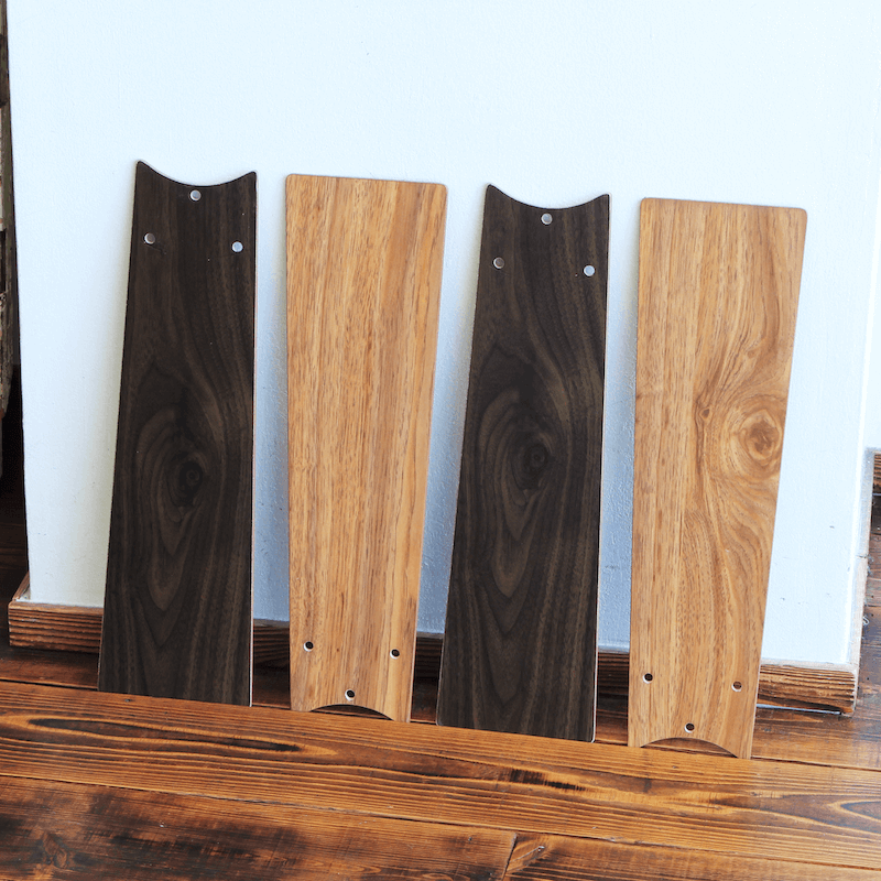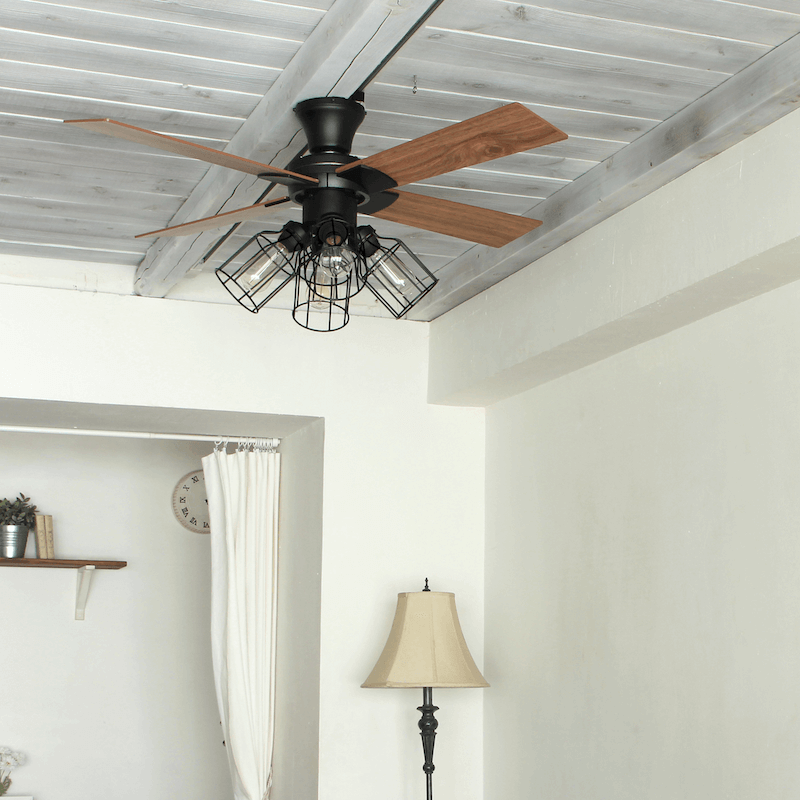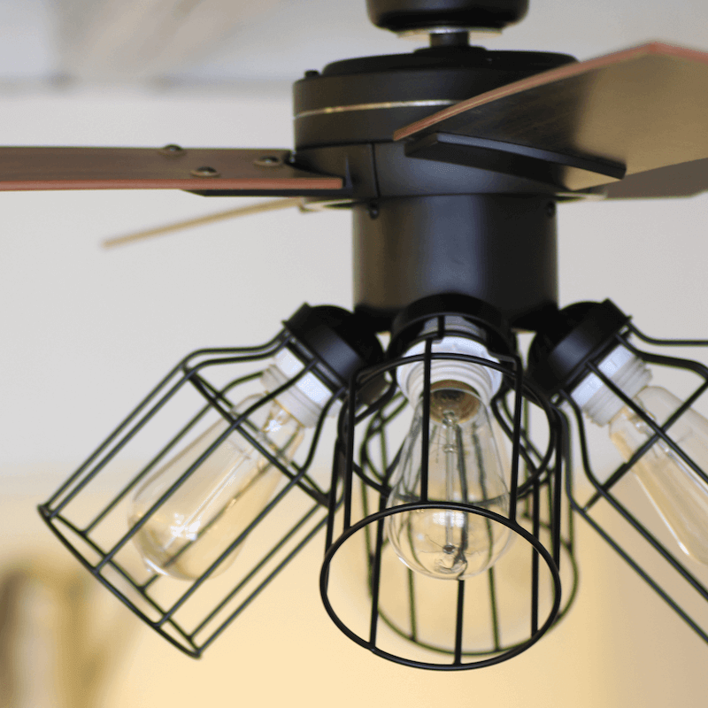 木目調のブレードと黒のワイヤーシェード。