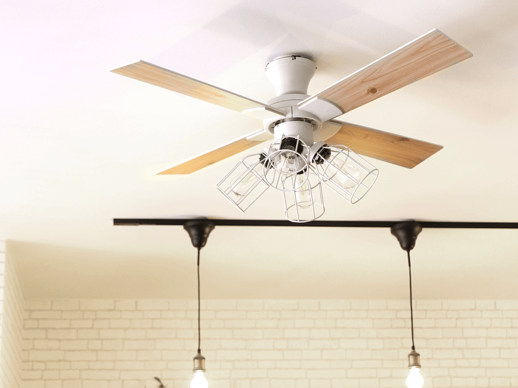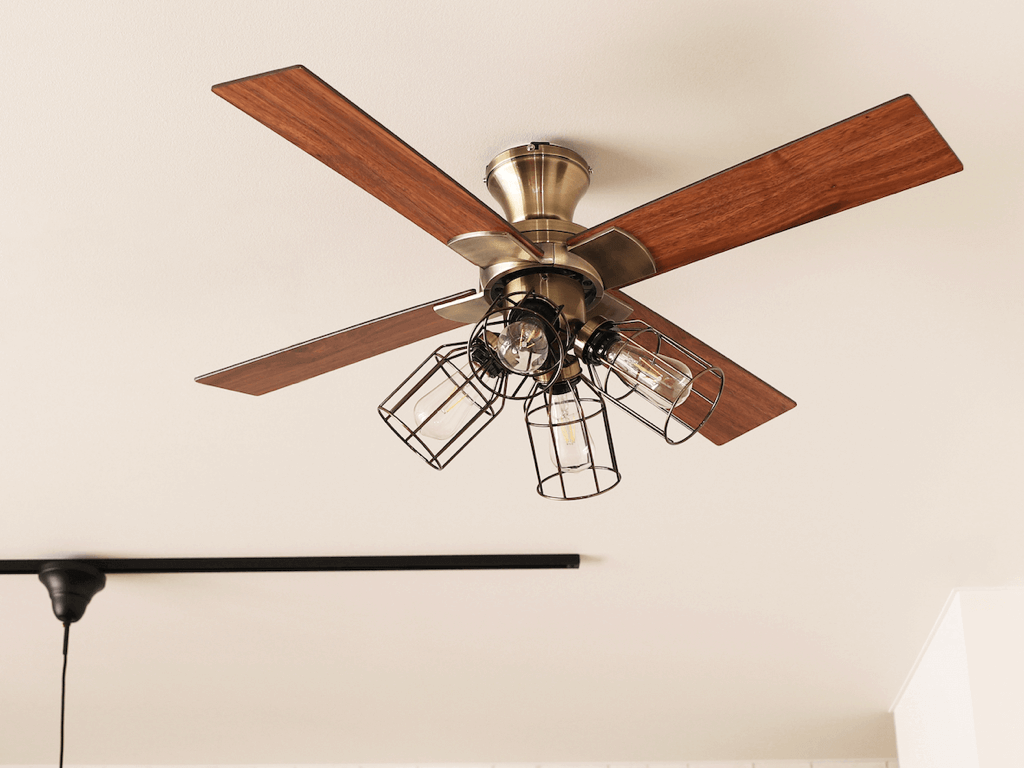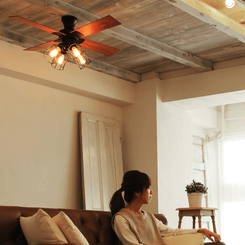 木目調の羽が付いた4灯照明付きのシーリングファンです。回転方向を切り替え可能で、空気を循環させ空調機の効率を高めます。