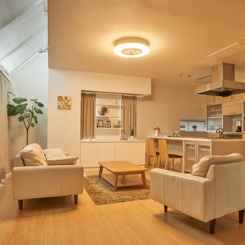 天井に直接取り付ける照明(シーリングライト)に室内の空気を循環させるための羽(ファン)を組みあわせたものを「シーリングファンライト」と言います。空間全体を明るく照らすシーリングライトの機能に、空気循環を促すサーキュレーター機能がついており照明と空調効率アップの2役を果たします。
