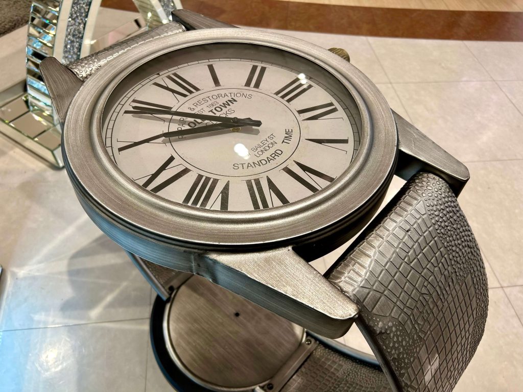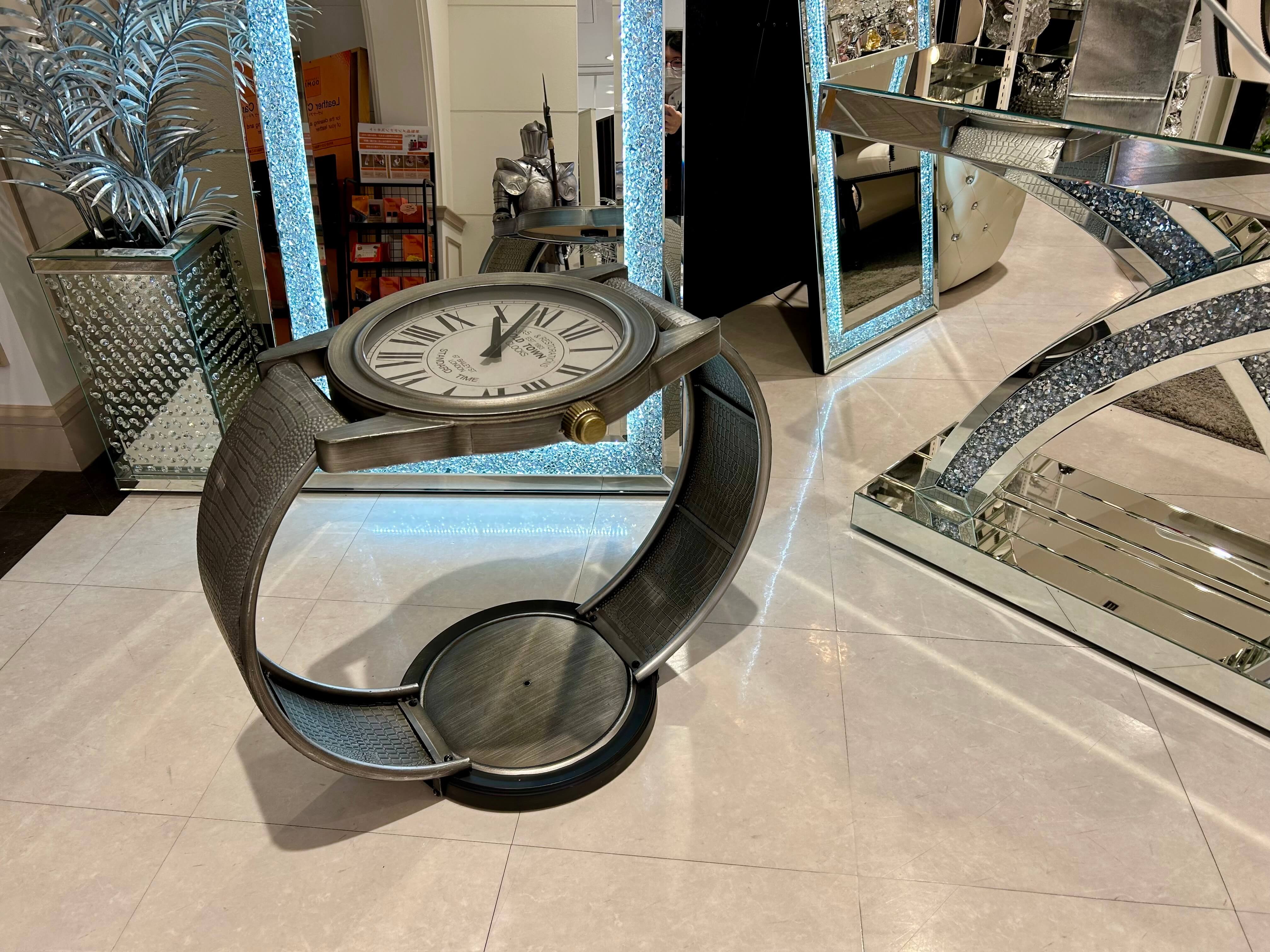 なかなかお目にかかれない腕時計型のサイドテーブルです。文字盤のある天板はガラスになっています。お部屋のアクセントにいいですね