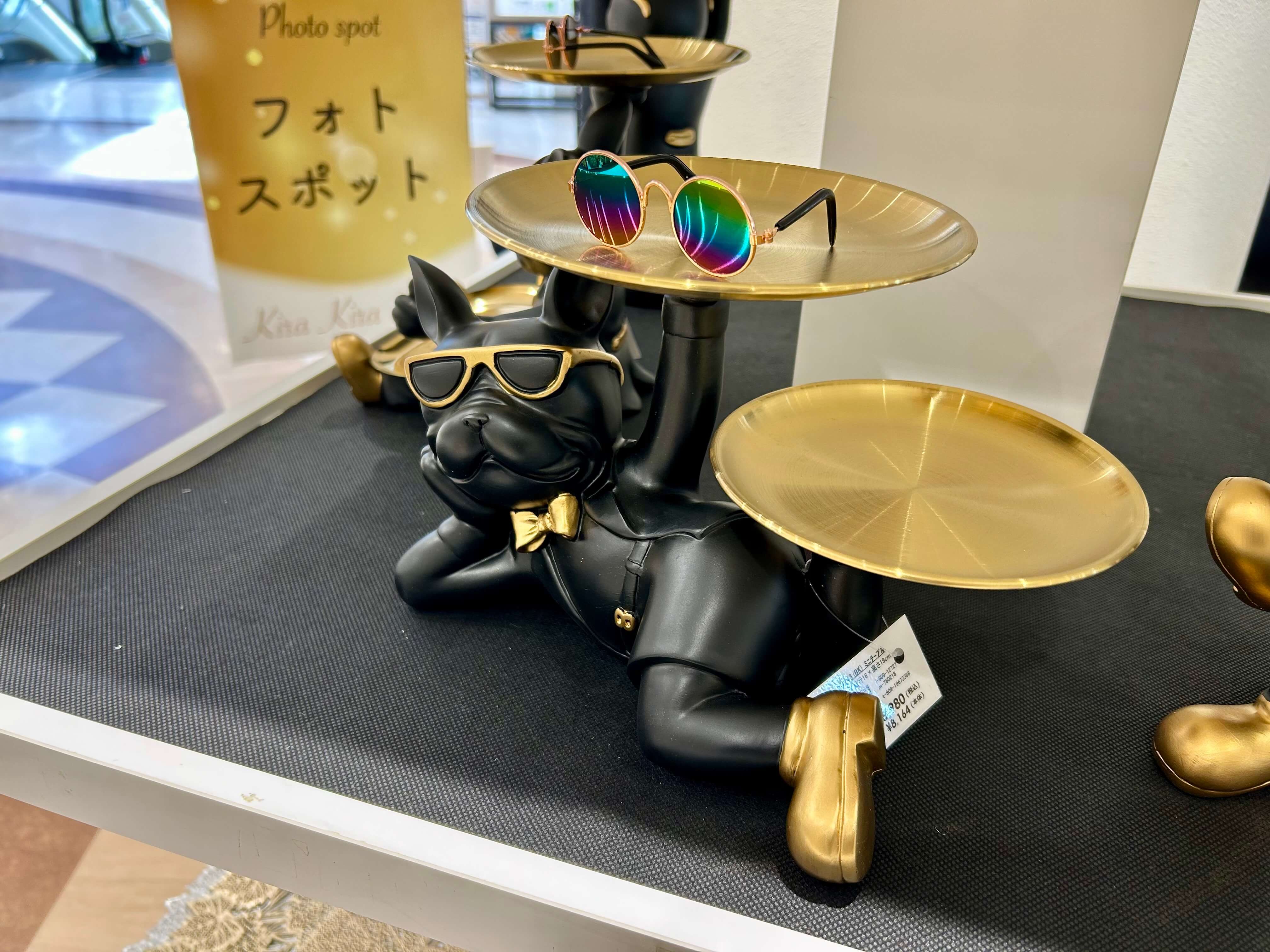 サングラスをかけたミニテーブル付きキャットです。こちらもポーズはいろいろあります!店頭で確認してみてください。