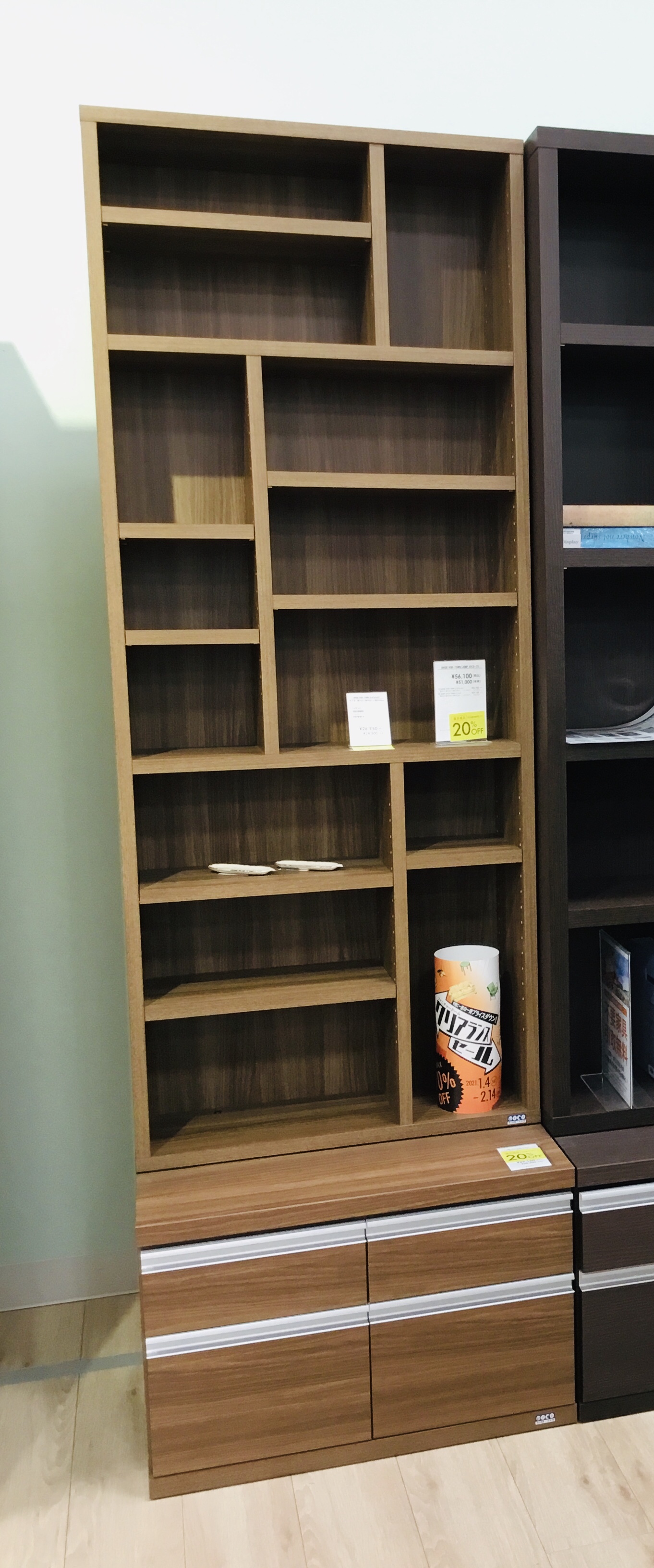 ⬇︎次に、上部がシェルフで下部が引出し2段になっている書棚。カラー、タイプ違いです。(他にもお取り寄せでタイプ違いが選べます。)
