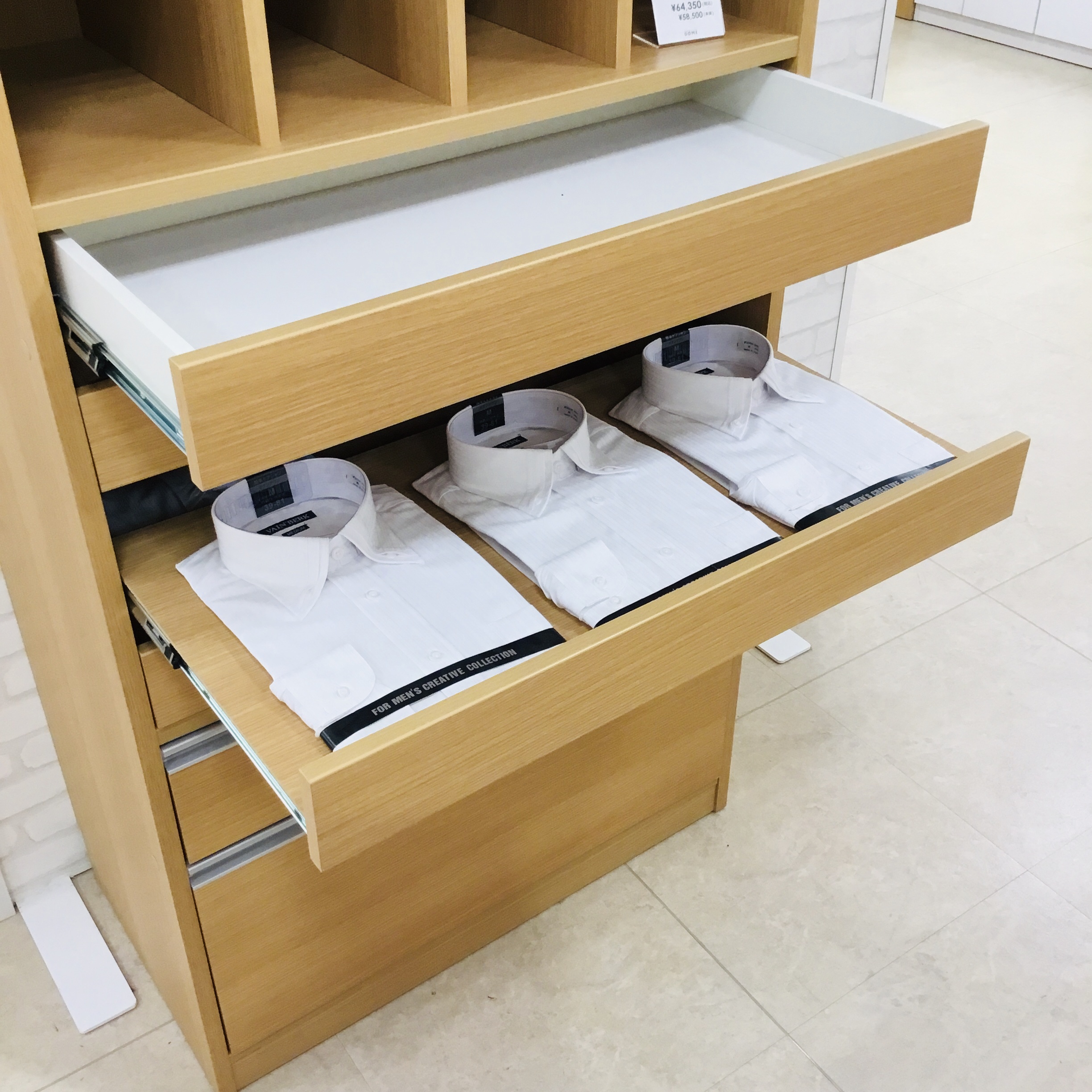 バッグ収納の下は、浅い引出しとYシャツ等を並べて一覧できるスライドタイプが3段になっています。